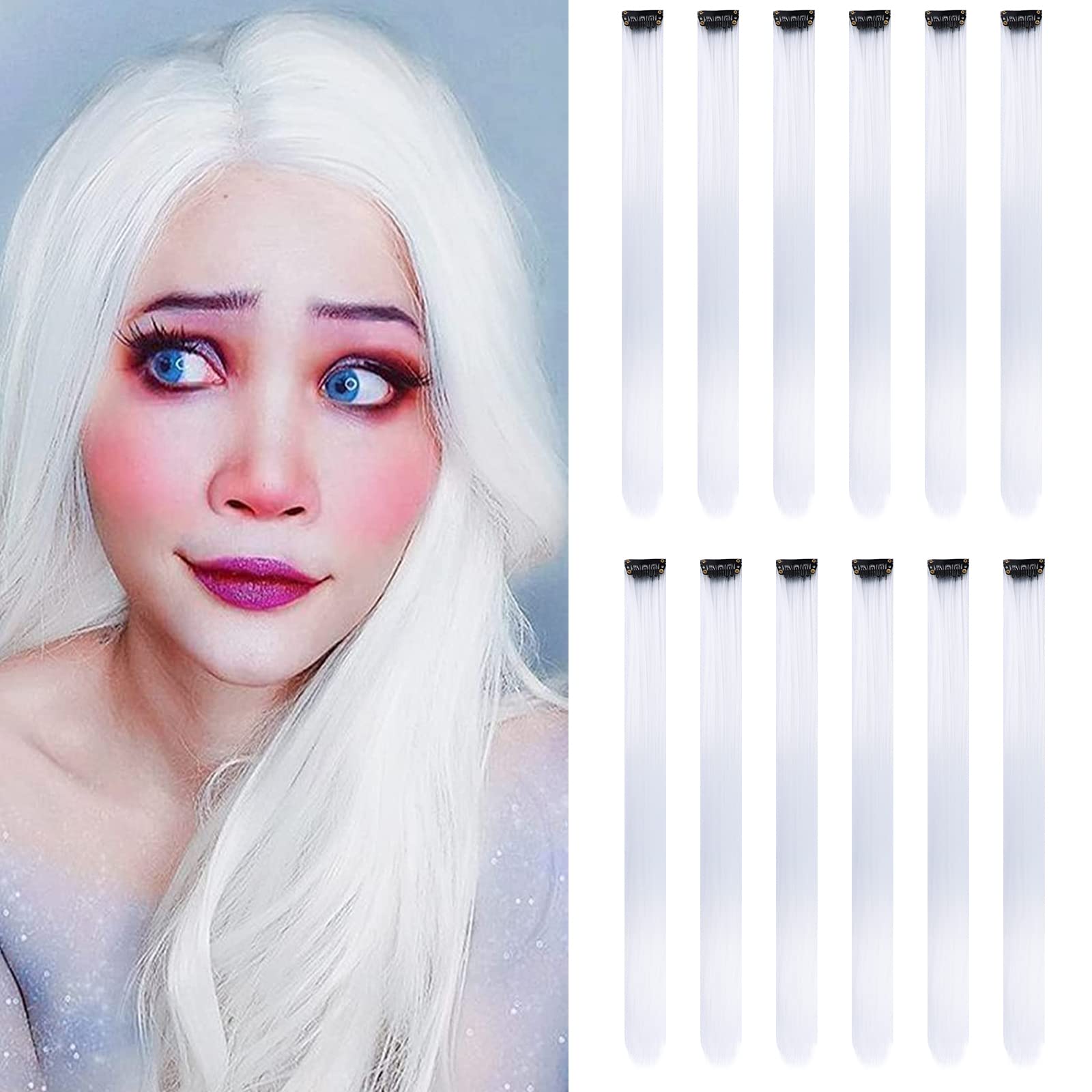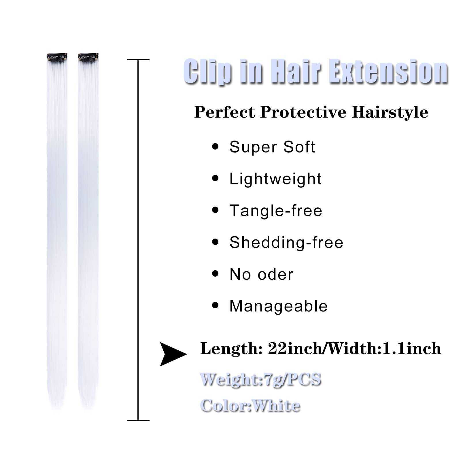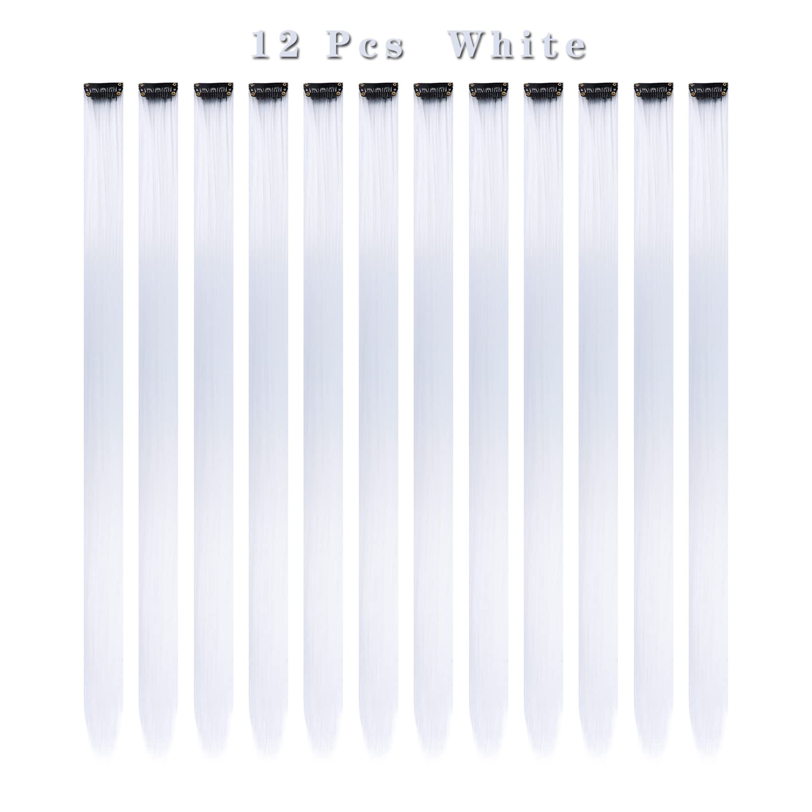 12PCS Colored White Hair Extensions Party Highlights Colorful Clip in Hair Extensions 22 Inch Straight Synthetic Hairpieces for Women Kids Girls Halloween Christmas Cosplay(White)