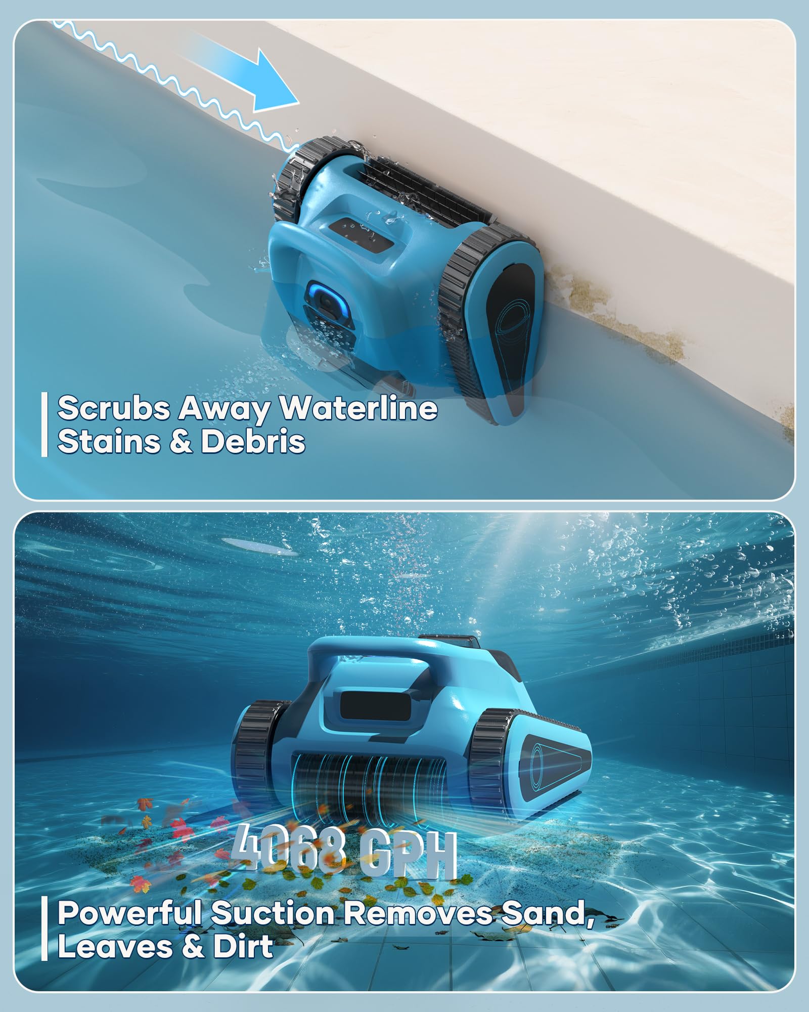 - 4068 GPH SUPERIOR SUCTION PERFORMANCE: Built for demanding conditions, this robotic pool cleaner features triple brushless motors with up to 3x the lifespan of standard motors. With 4068 GPH suction and four active brushes, this pool vacuum robot removes debris from palm fronds to fine sand across floors, walls, and waterlines.