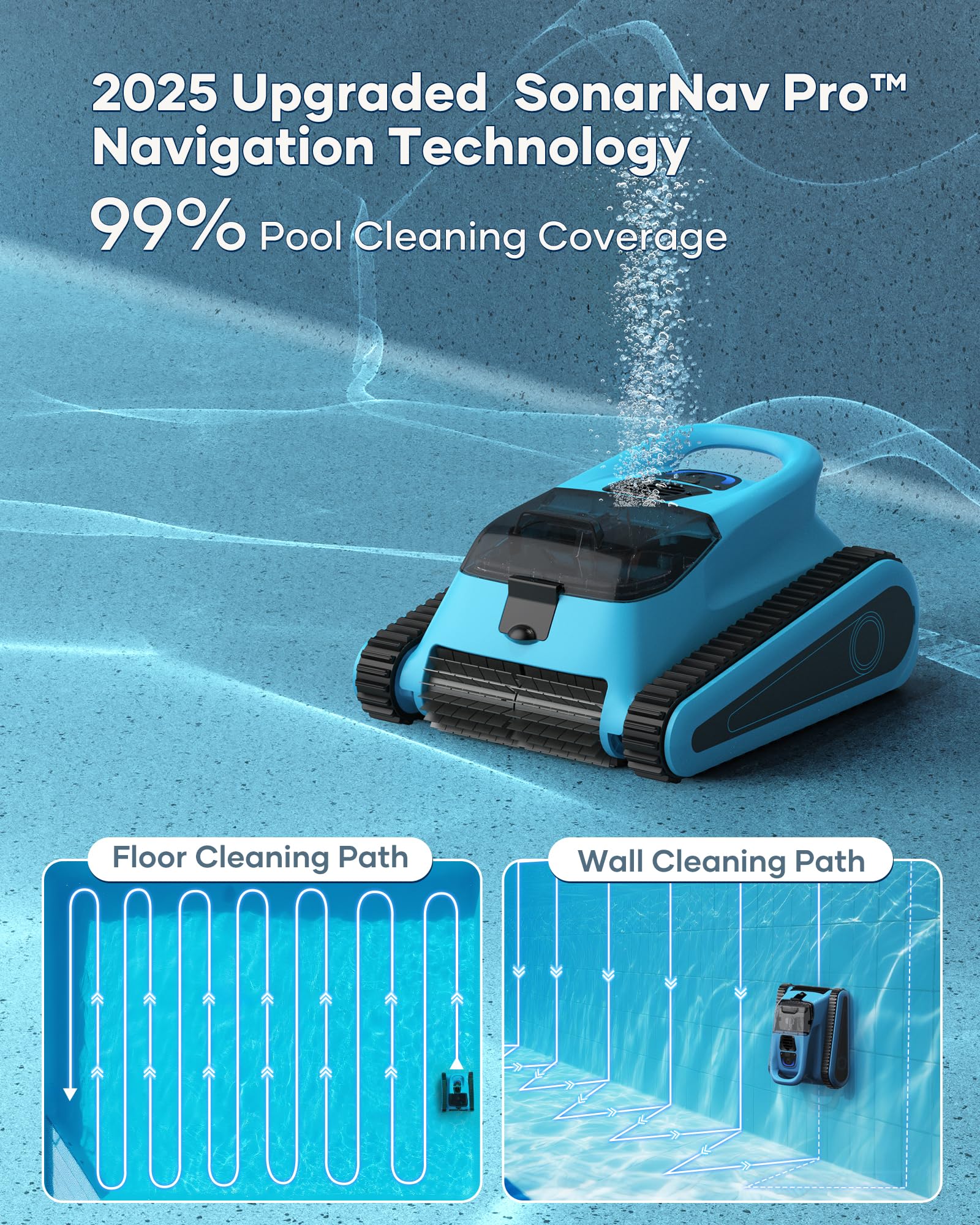 - SMART NAVIGATION FOR ANY POOL: Upgraded with 2025 SonarNav Pro, this pool robot vacuum adapts to complex layouts—handling slopes, drains, steps, and ledges as shallow as 1.6 ft. Ideal for inground pools up to 16.4 ft deep, and compatible with concrete, tile, or vinyl surfaces.