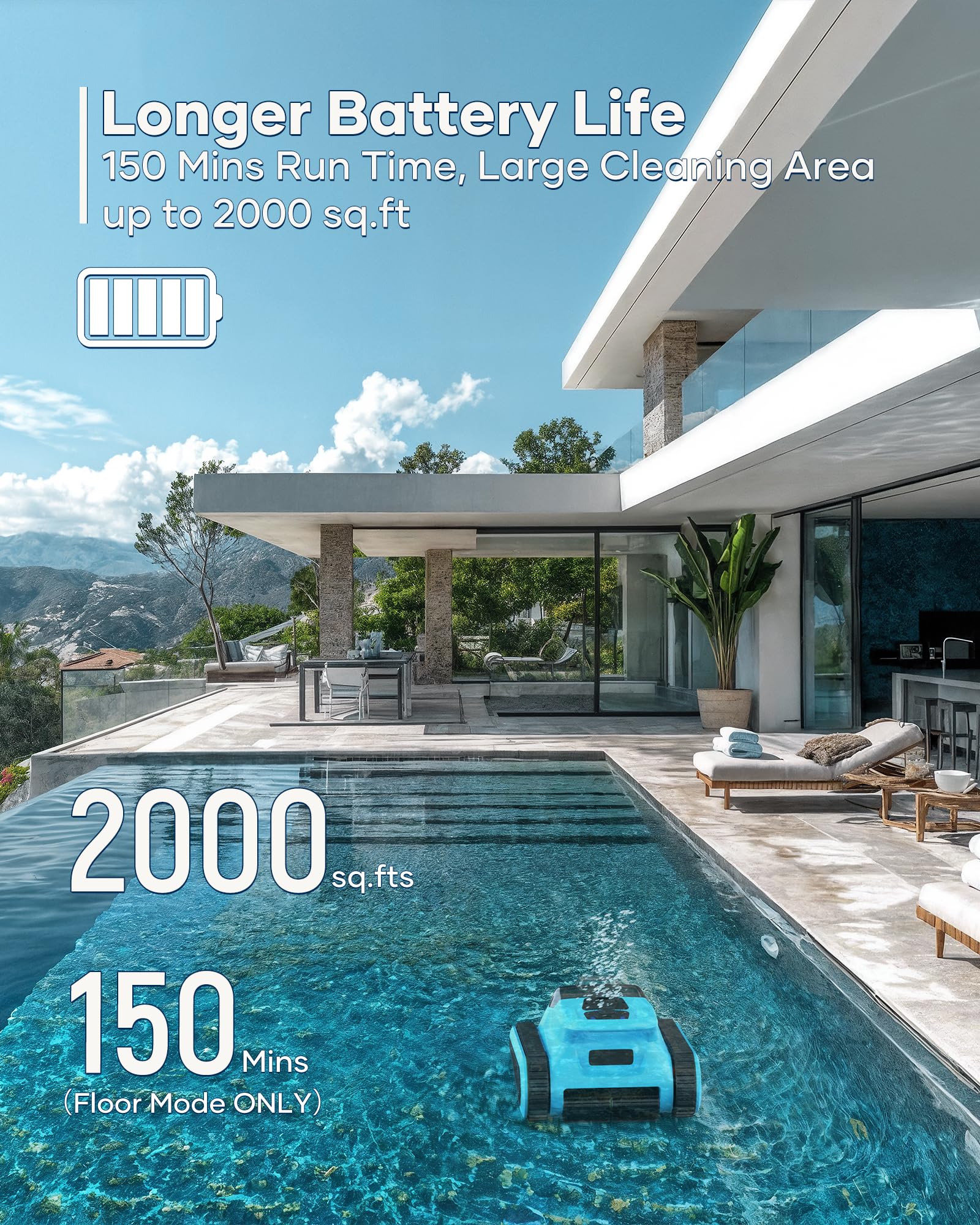 - CORDLESS WITH LONG RUNTIME: This cordless pool vacuum cleaner delivers up to 150 minutes of runtime and covers up to 2,000 sq. ft. on a single charge. The waterproof lithium battery recharges in 2.5 hours and includes built-in safeguards against overcurrent, overcharging, and overheating—helping reduce fire risk and ensuring safe operation.