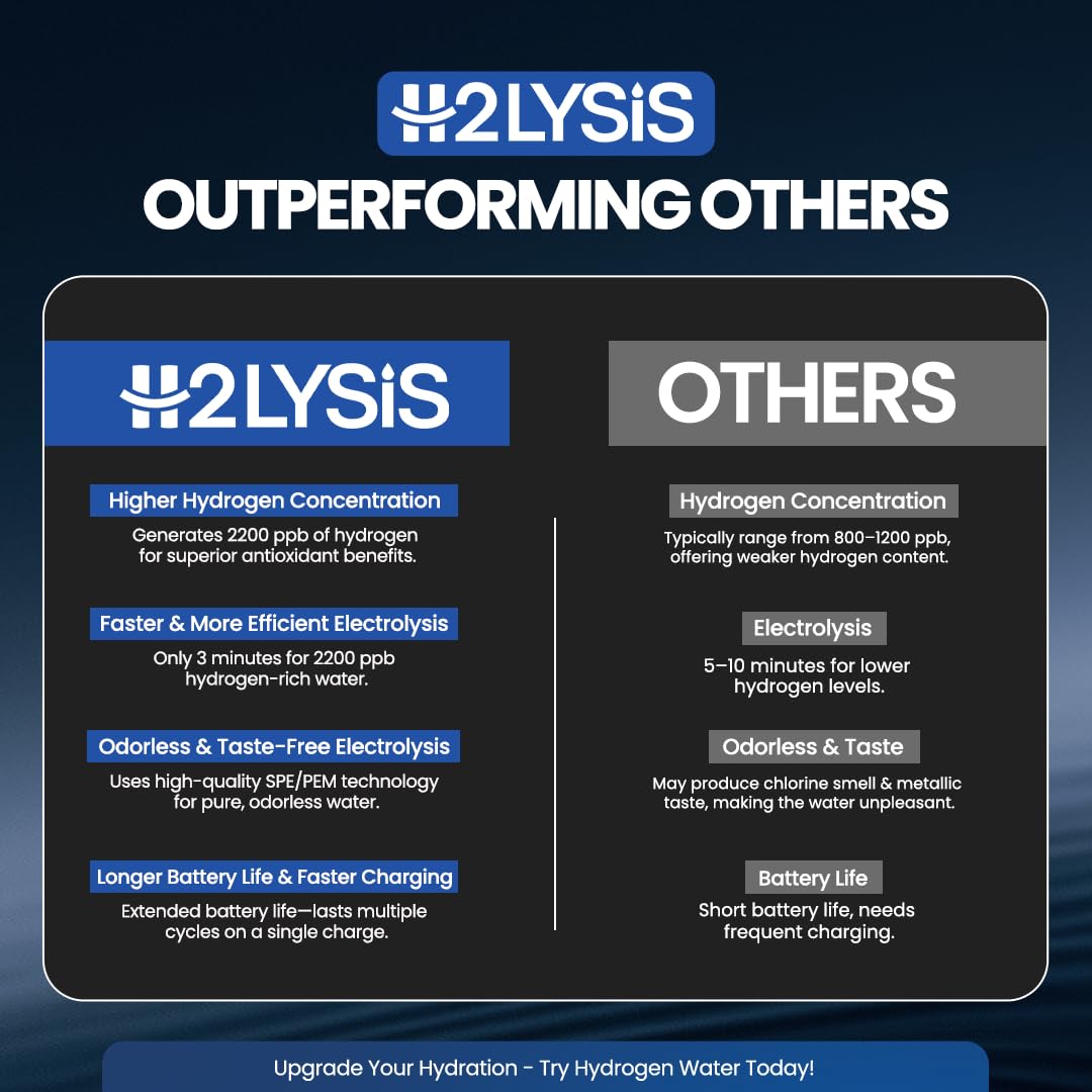 - 💧Hydrogen Water Machine Experience clean, high-concentration pure H₂ in 3 Minutes with a portable Water Ionizer. This advanced hydrogen water machine by H2Lysis functions as a sleek, rechargeable hydrogen water bottle, delivering 2200ppb of antioxidant-rich water anytime, anywhere.