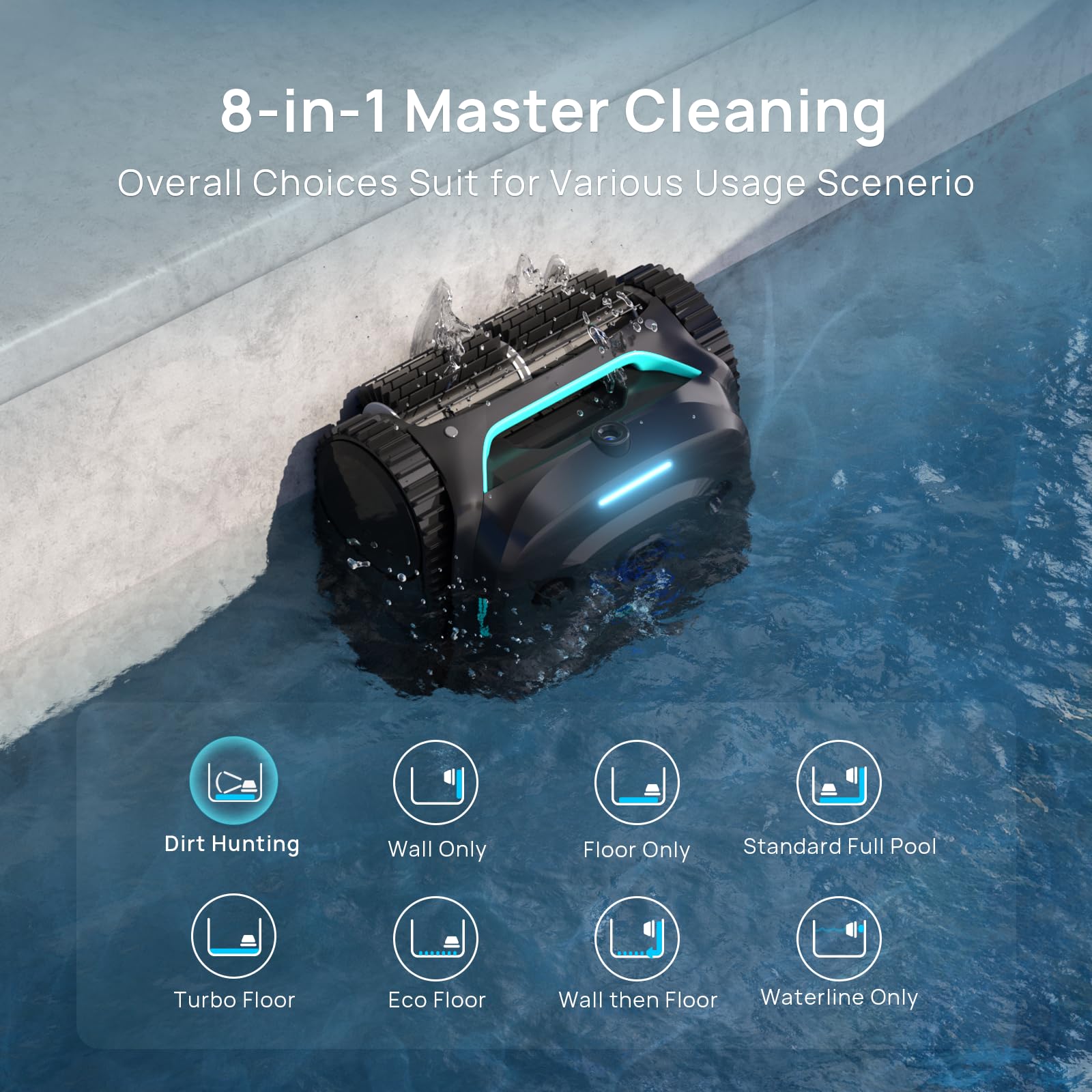 - 8 Mode Cleaning: With the WYBOT App, you can choose any appropriate mode in “Waterline Only” “Wall Only” “Floor Only” “Standard Full Pool” “Turbo Floor” “Eco Floor” “Wall then Floor” “Dirt Hunting”