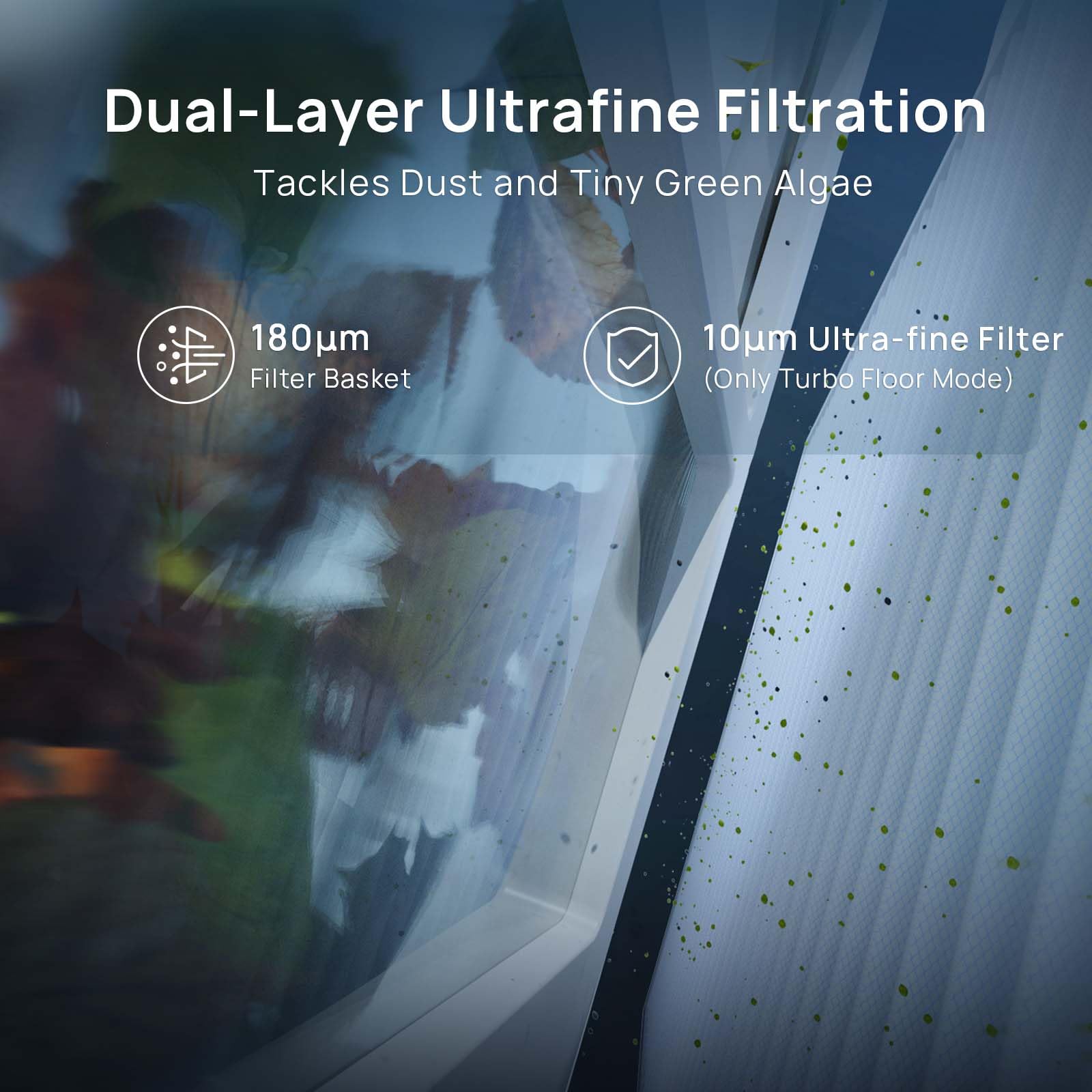 - Ultra-Fine Dual-Layer Filtration: To thoroughly remove fine particles such as green algae, dust, and sand, you can install a 10-micron ultra-fine HEPA filter as a secondary filter in “Turbo Floor” mode