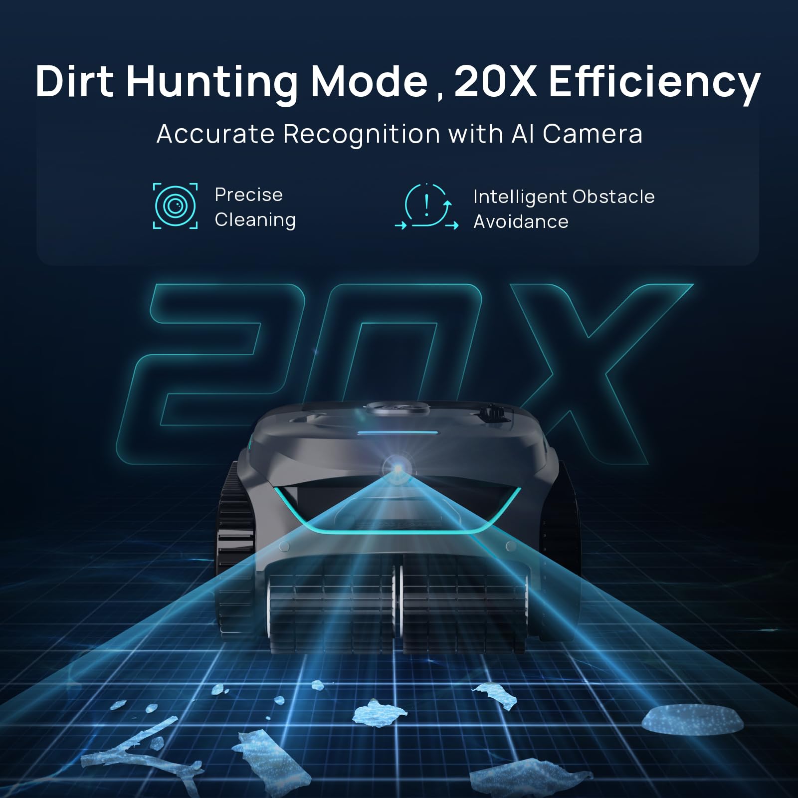 - AI Learning Enables a Customized Pool Database: In the first month, the AI will learn more about debris and obstacles to plan optimal path, allowing it to become your customized pool cleaning robot with up to 20x efficiency improvement