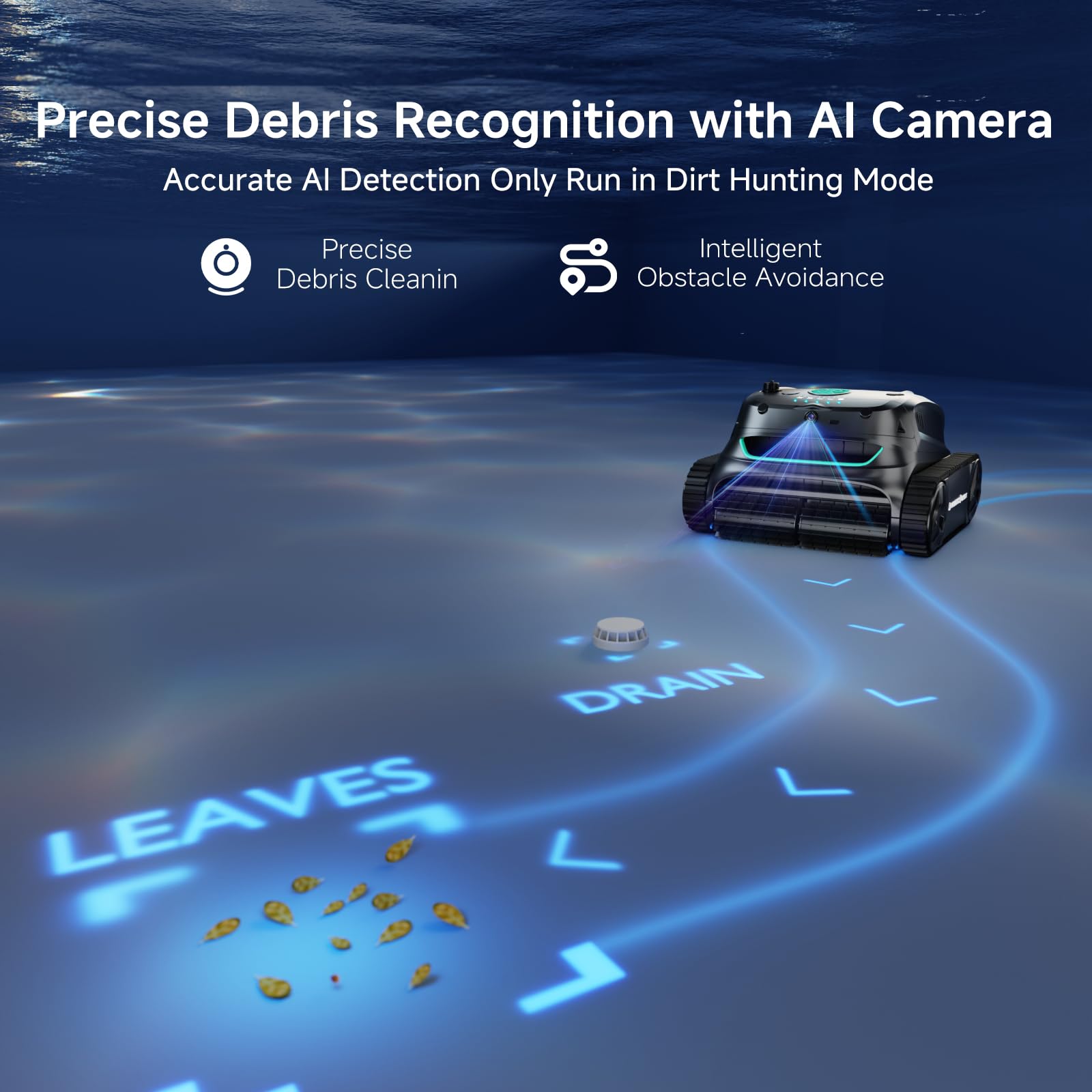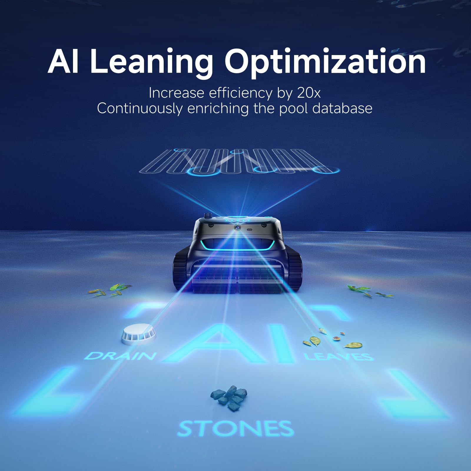 - AI Learning Enables a Customized Pool Database: In the first month, the AI will learn more about debris and obstacles to plan the best cleaning paths, transforming it into your customized pool cleaning robot, improving efficiency by up to 20 times