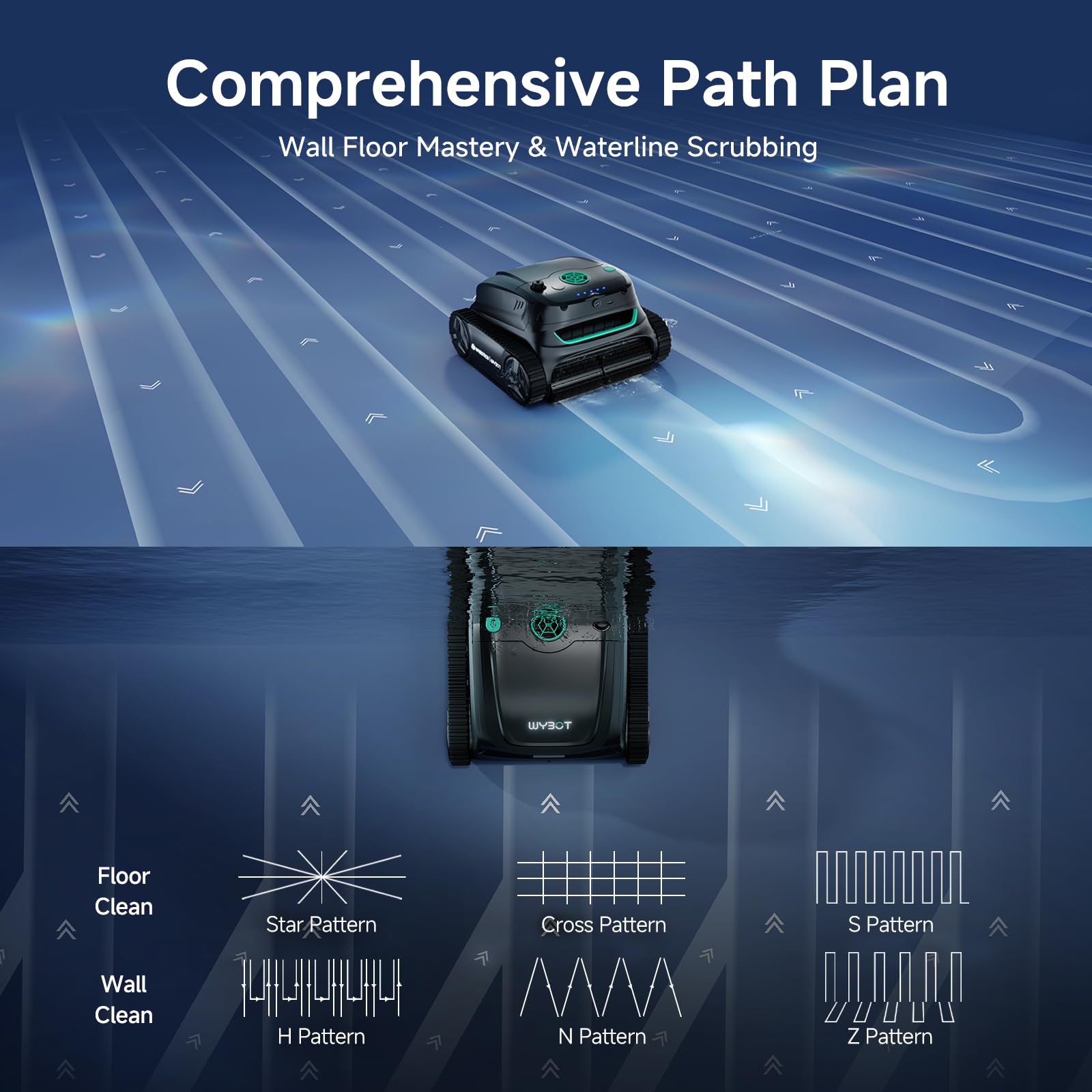 - 8-in-1 Cleaning Modes and One-touch Mode Choose: Using the WYBOT App, you can select from modes such as “Waterline Only,” “Wall Only,” “Floor Only,” “Standard Full Pool,” “Turbo Floor,” “Eco Floor,” “Walls then Floor,” and “Dirt Hunting” for AI vision function. Further more, there is a “Touch Bar” on the top of machine,you can easily switch modes by touch the “Mode” key
