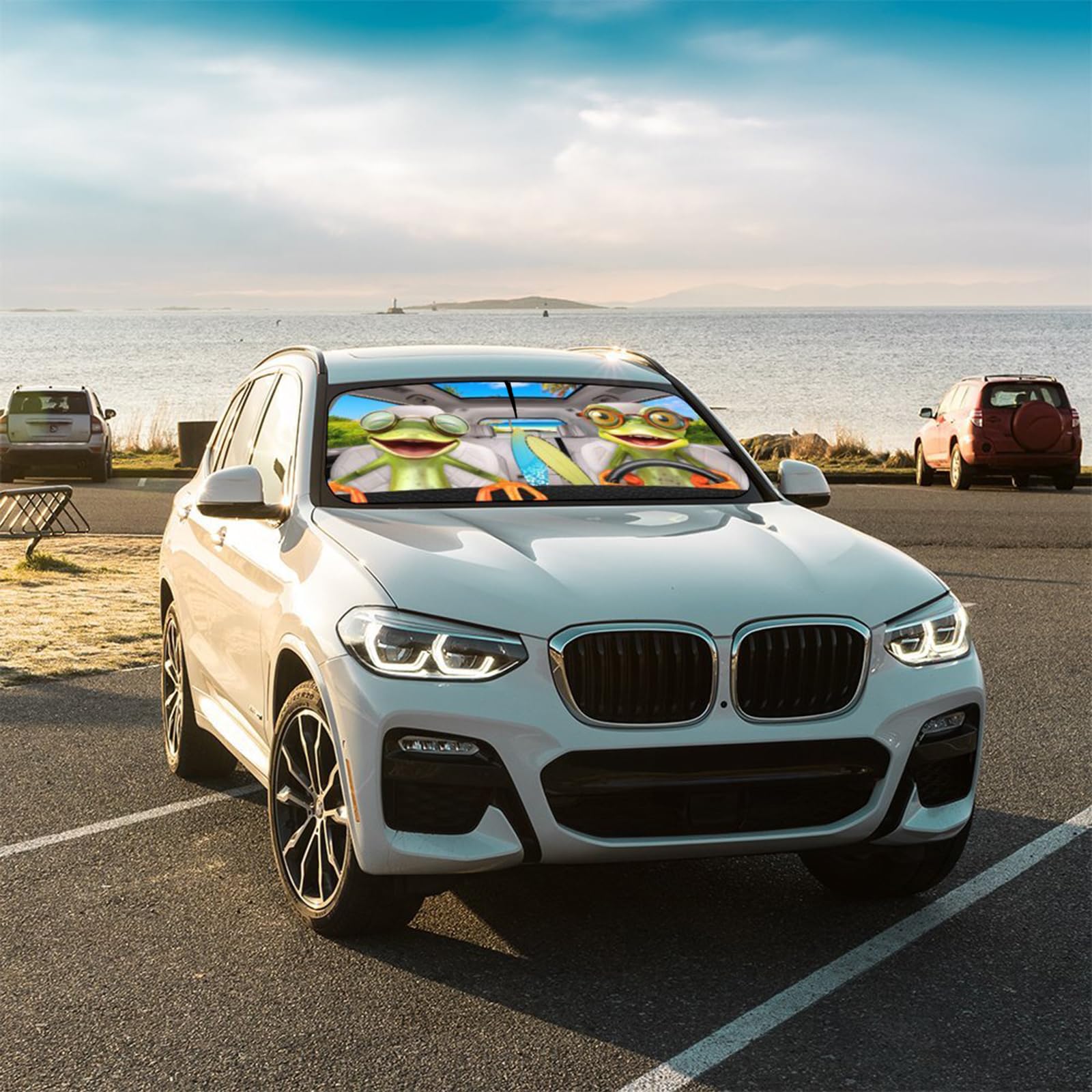 - 【Efficient Sun Protection】 Funny frog driving car windshield sun shade umbrella can effectively block thermal ultraviolet rays. Not only does it perfectly reflect sunlight, but it also prevents the dashboard and interior from being damaged fading and shortening the vehicle cooling time to keep the vehicle cool and comfortable.