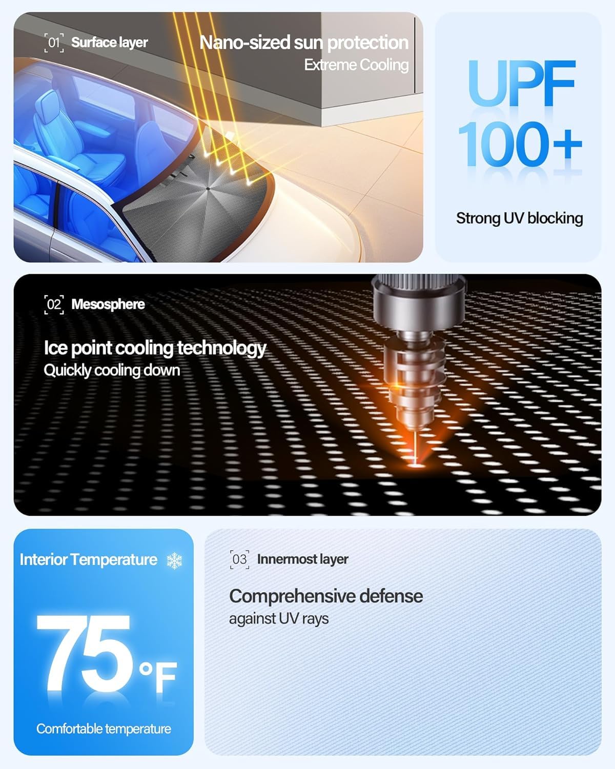 - [3D Nano Condensation Tube Dispensing] The interior of the Yampahap windshield sun shade is equipped with 3D dispensing covered with nano-sized condensation tubes, the heat residual temperature is condensed and transferred to the surface to diffuse into the interior space of the car, bringing coolness. It can protect the car interior and create a comfortable and cool space for your family, baby and pets.