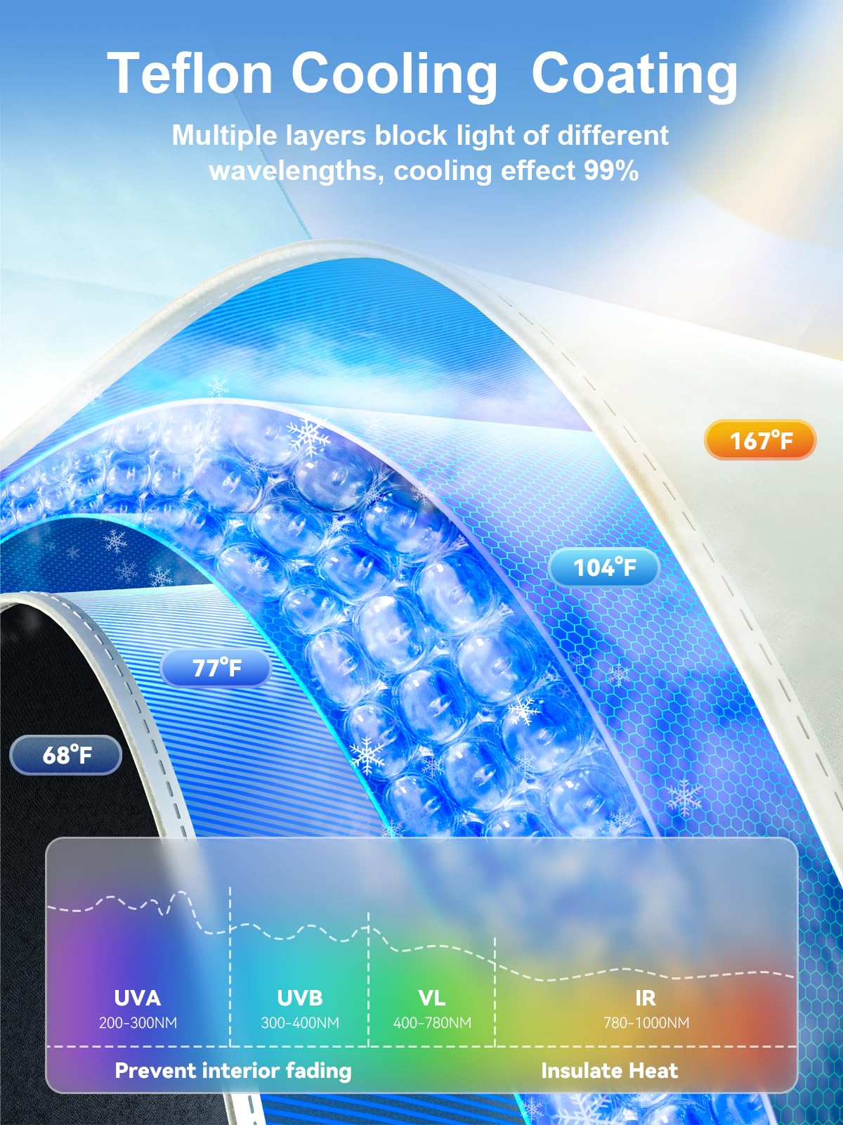 - 【Advanced Sun Protection】Unlike traditional silver-plated fabrics, this sunshade uses a premium 240T high-density base fabric and a polyester reflective cooling coating. This advanced combination provides excellent protection against a wide range of harmful UV rays, protecting your car dashboard and seats from damage.