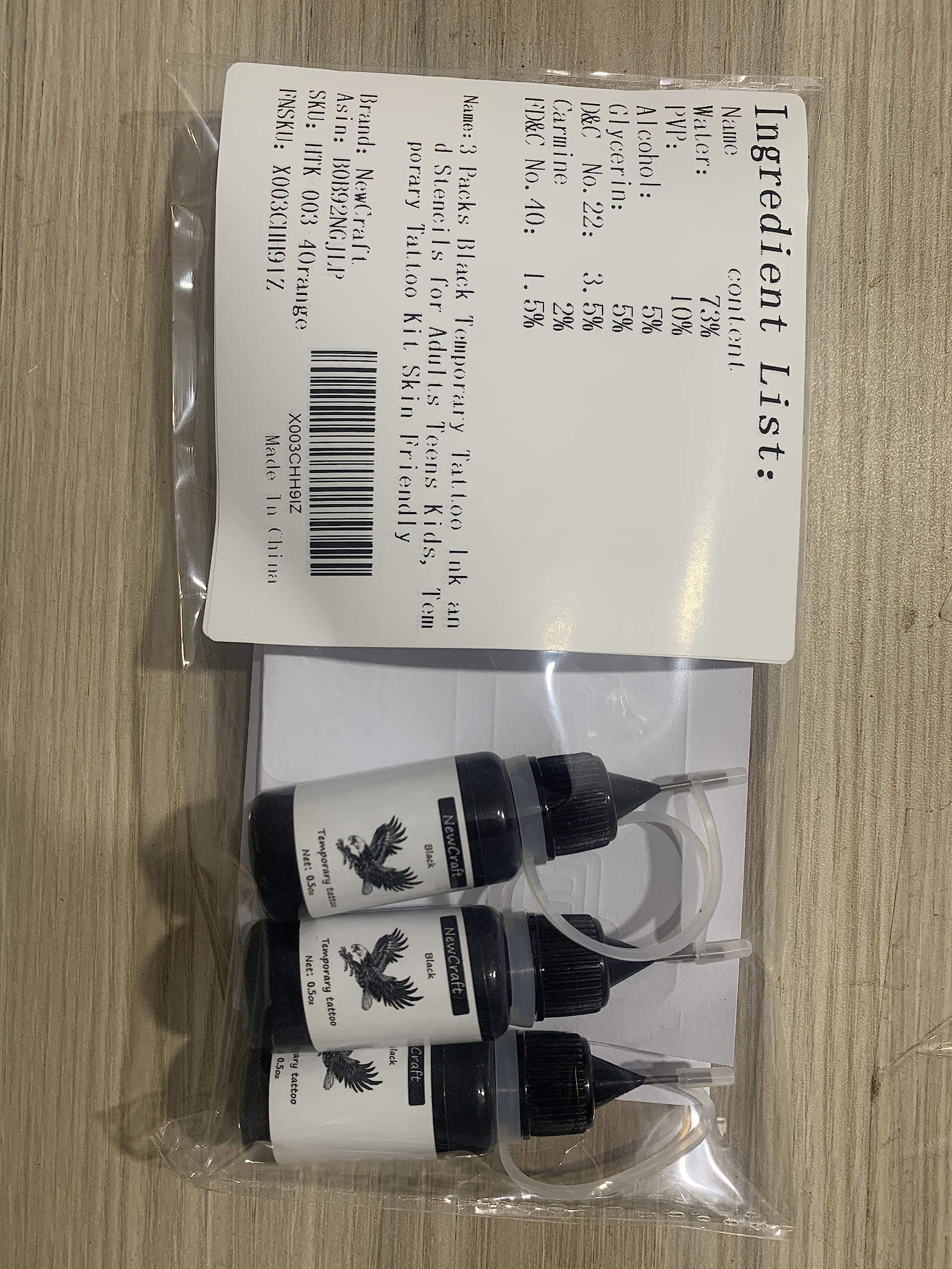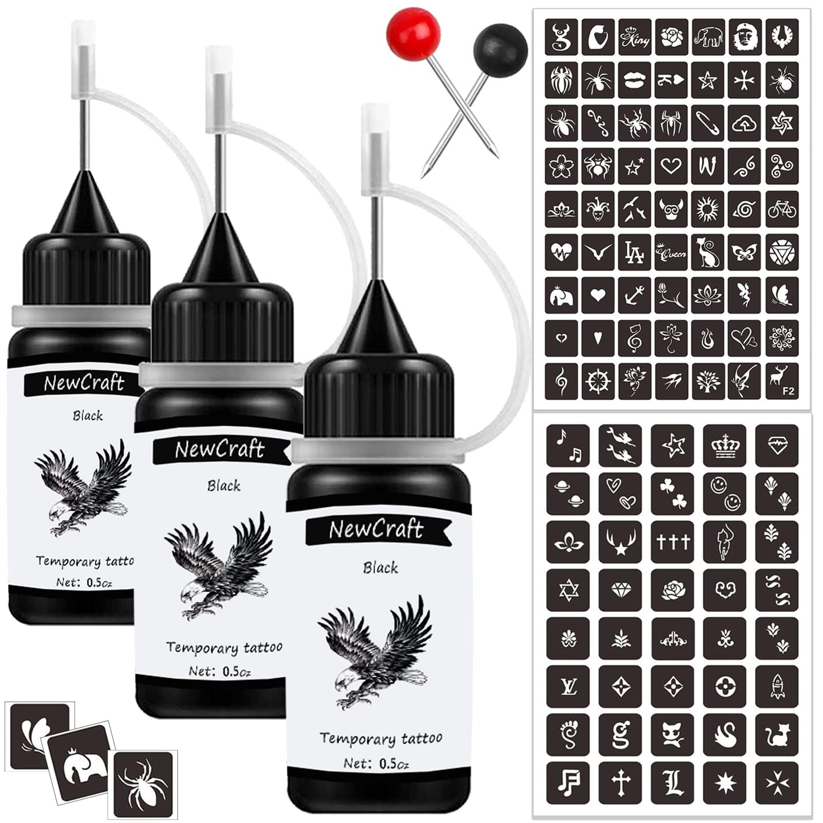 - PACKAGE: There are 3 packs black temporary tattoo ink, 103 patterns tattoo stencils and one pin.