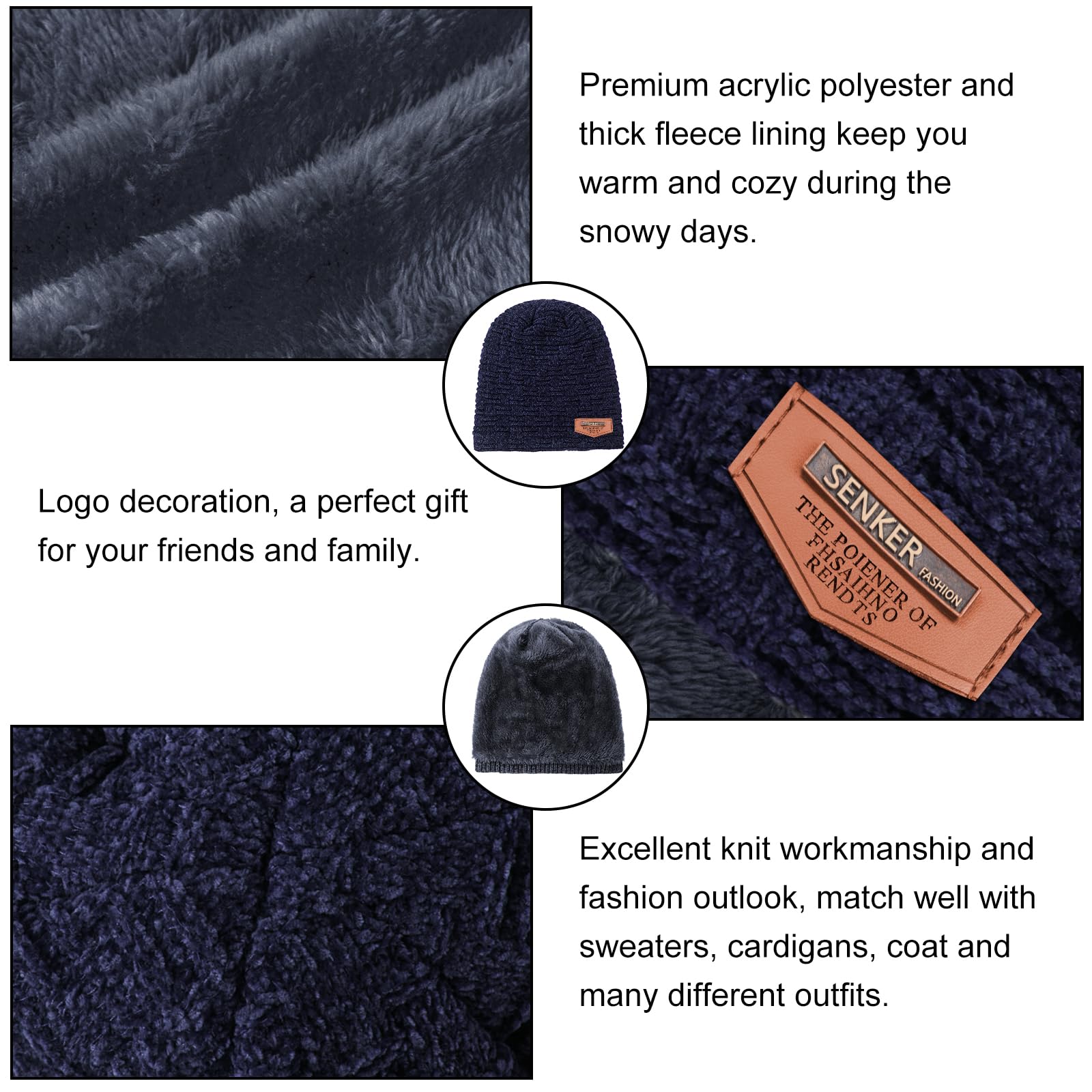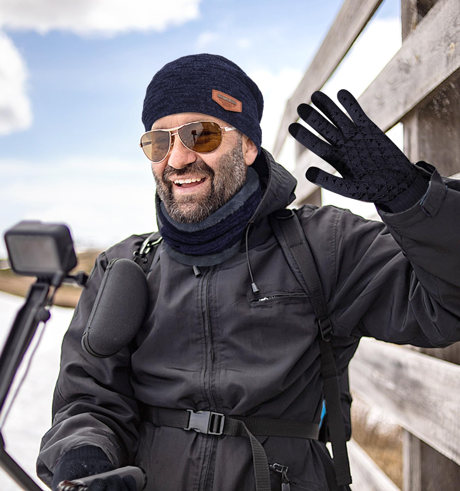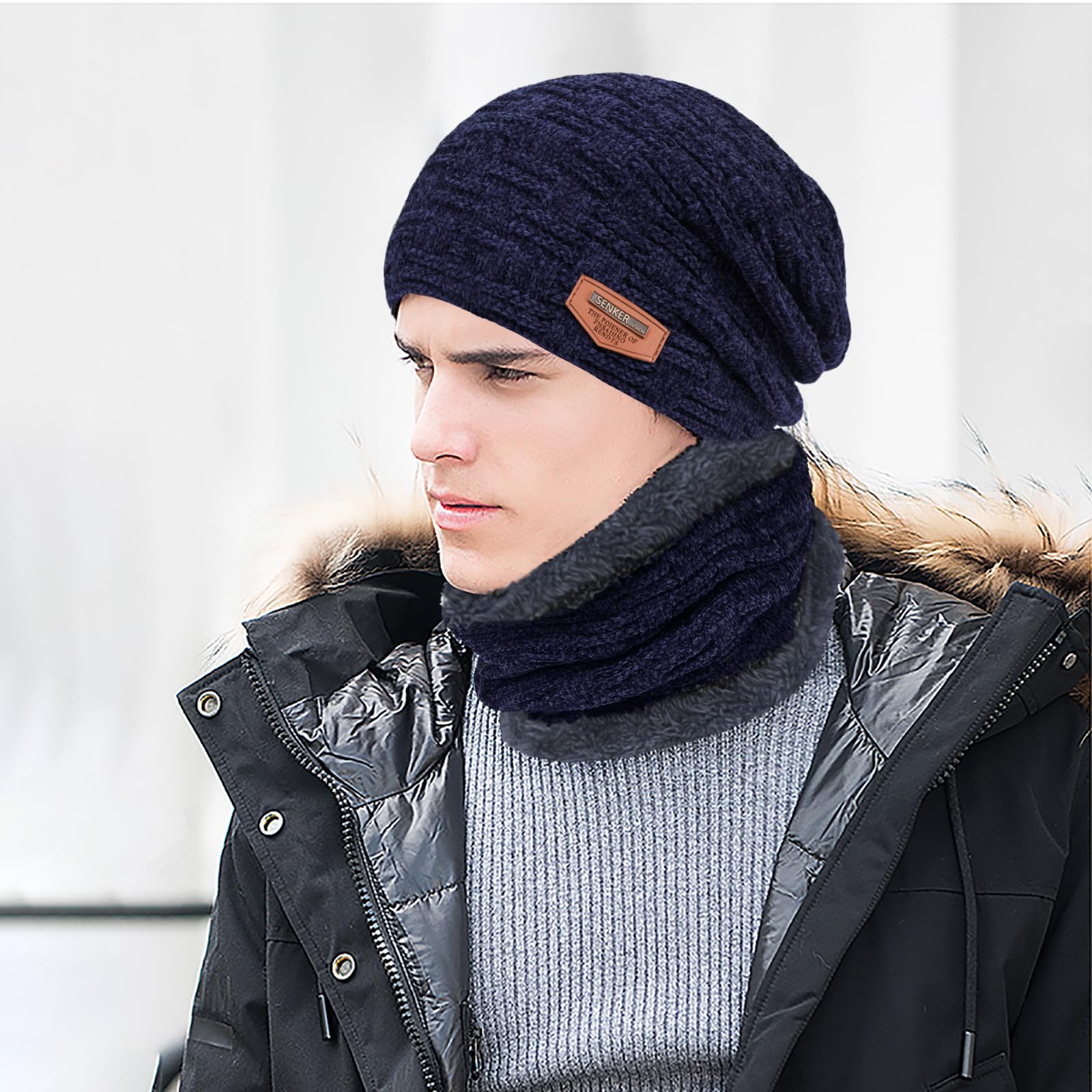 - Package include: 1 X knit mens winter hat, 1 X scarf neck warmer and 1 X black touch screen gloves(3 in 1 hat and scarf set for men)