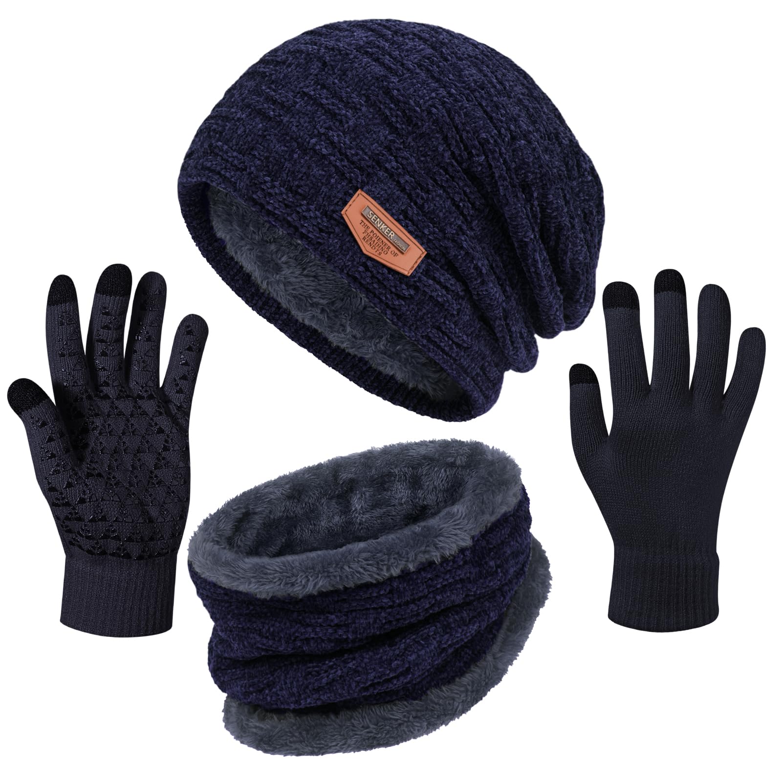 3 Pieces Winter Hat Scarf and Gloves Set for Men and Women, Knit Slouchy Beanie Cap Neck Warmer Screen - Touch Texting Gloves Navy