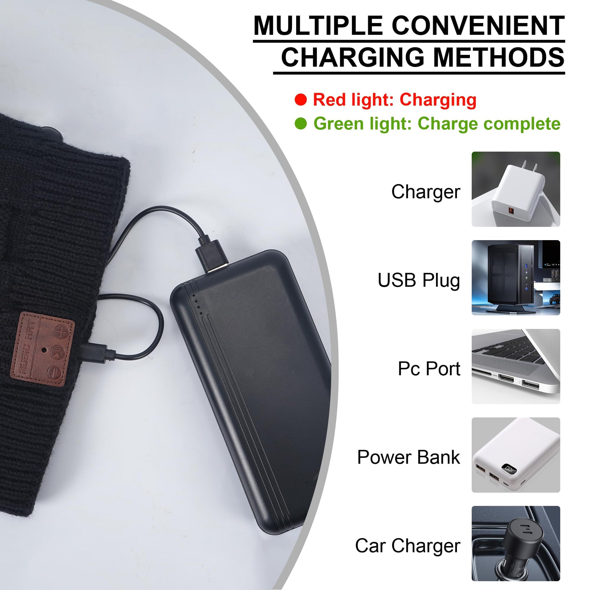 - 【LONG LASTING PERFORMANCE】The beanie with headphones has a built-in rechargeable 300mAh LiPO battery, which takes 1.5-2 hours to charge and can provide up to 12+ hours of music or 24+ hours of talk time, and 350 hours of standby time. No more tangled wires, enjoy hands-free music and calls easily. Whether it is winter outdoor sports such as running, skiing, hiking, camping, dog walking, fishing or shopping, it can meet your needs.
