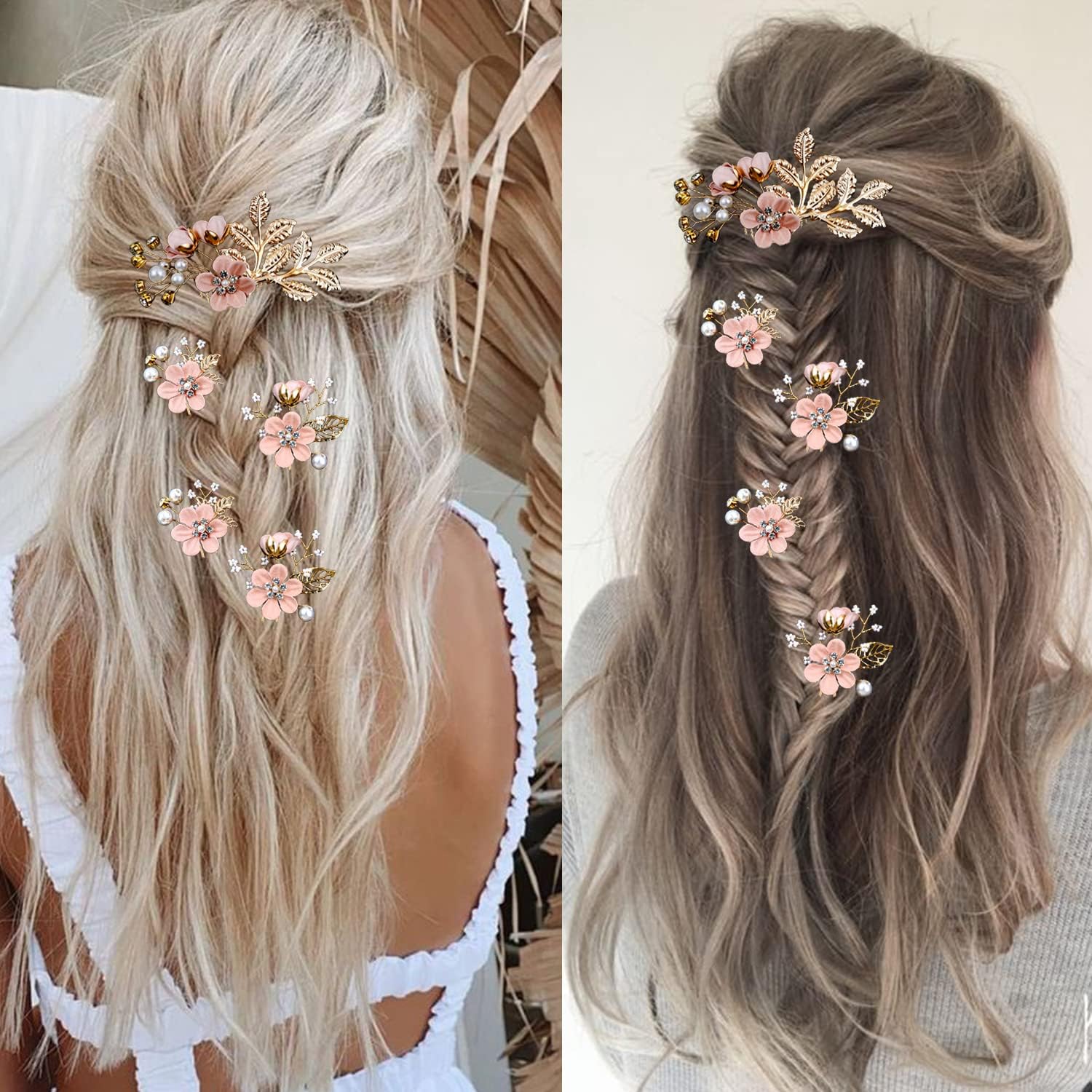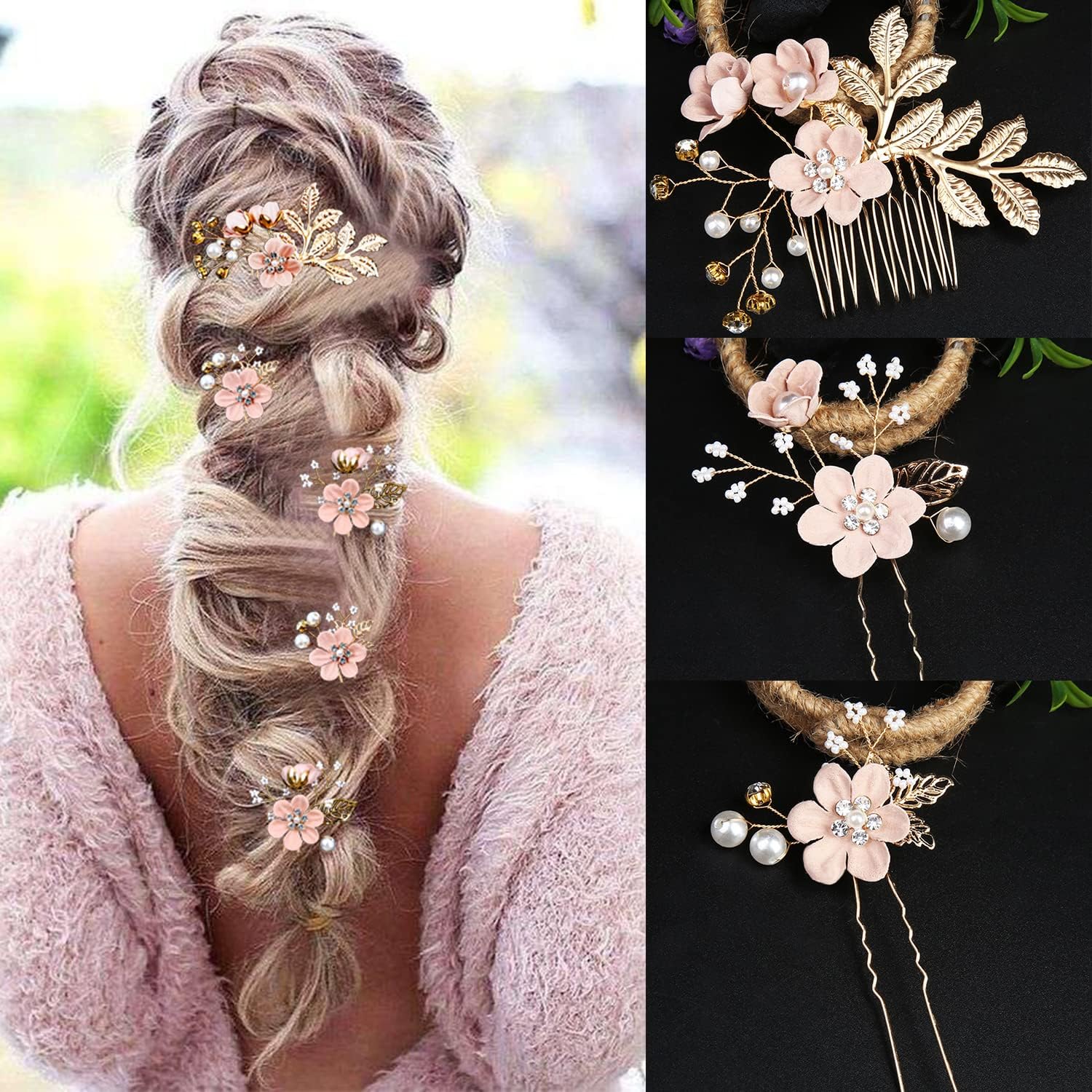 5 PCS Bridal Flower Wedding Hair Pins Crystal Pearl Hair Clips Headpiece Gold Wedding Hair Accessories Jewelry with Rhinestone for Brides Bridesmaids Women Girls Updo(Cherry Blossoms Pink)
