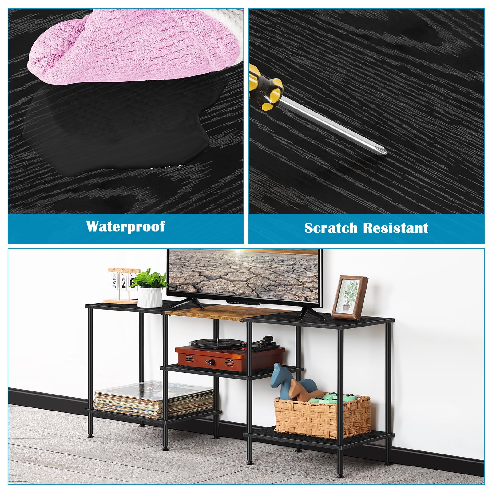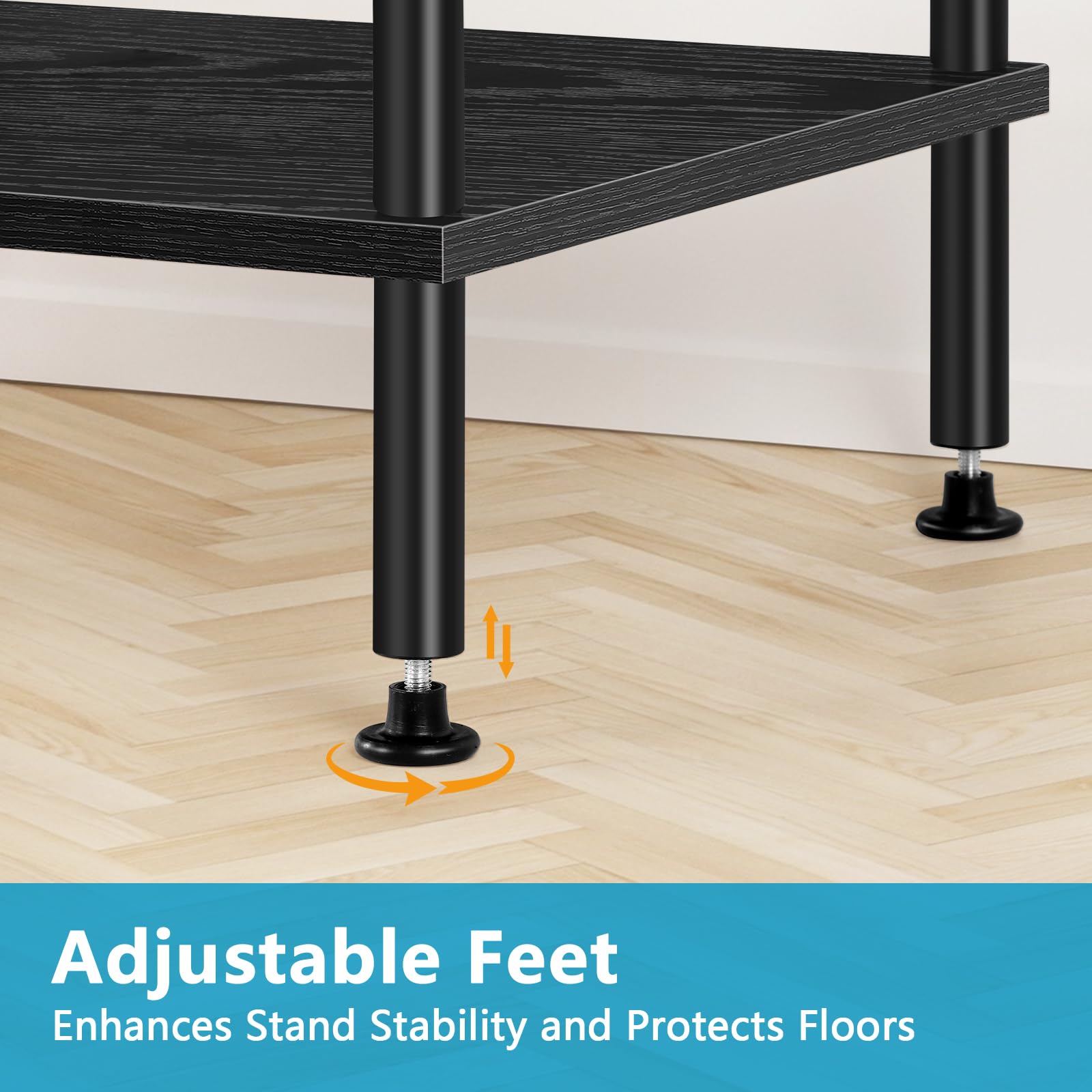 - Reliable & Sturdy: The sturdy metal frame ensures the overall stability and durability of the black TV stand, easily supporting the weight of the TV without wobbling, equipped with adjustable foot pads on the bottom, it will not be affected although your floor is uneven