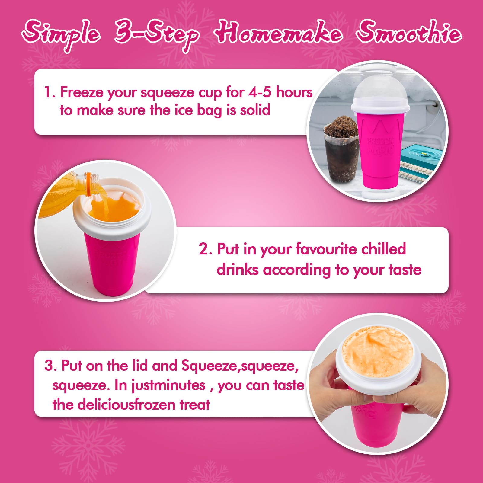 - 【Easy to use】1: Freeze the Slushy Maker Cup 4-6 hours in advance. 2: Pour juice, milk, yogurt, soda, etc. into a cup and cover it with a lid; 3: Use your fingers to squeeze the smoothie cup for 1-3 minutes, and a delicious smoothie will be done. Notice:Do not fill the drink too much, the drink should be cold and not exceed 2/3 of the cup body