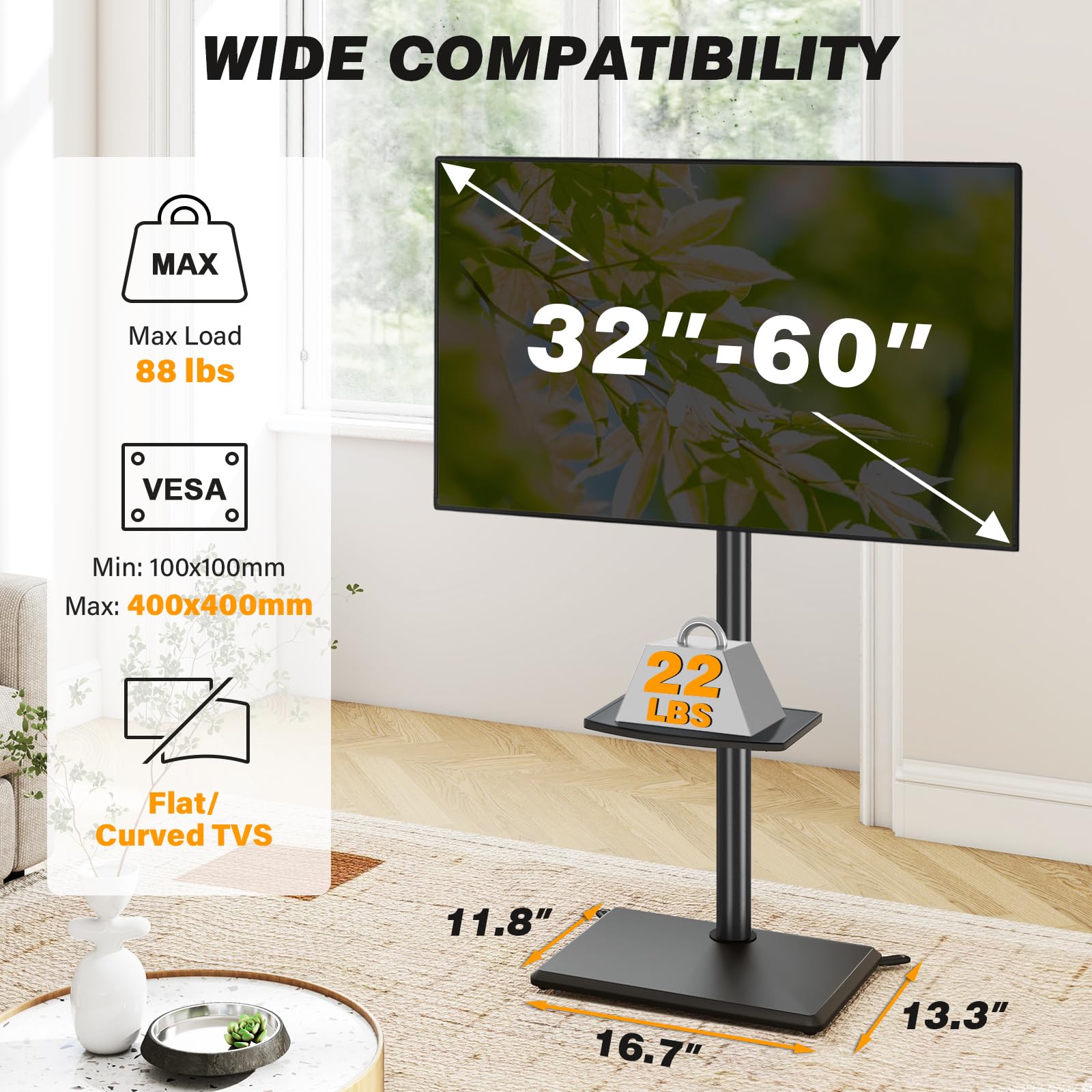5Rcom Floor TV Stand with Mount for 32-60 inch TVs, Swivel and Height Adjustable Floor Standing TV Stands with Wood Base, Tall TV Stand with Shelf up to 88 lbs for Living Room, Bedroom and Corner