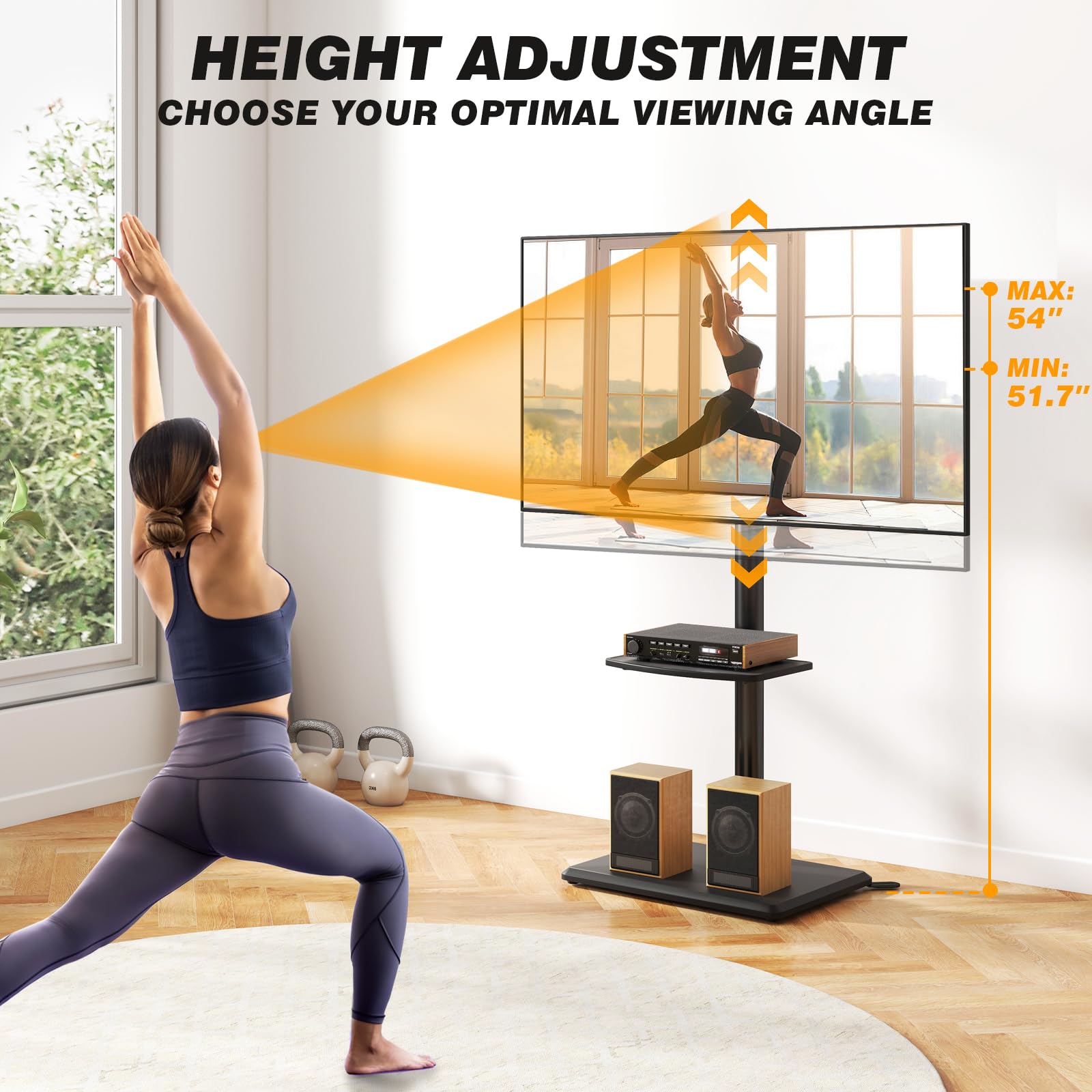 - 【ERGONOMIC HEIGHT ADJUSTMENT - CUSTOMIZED VISUAL ALIGNMENT】This floor TV stand enables personalized screen positioning with height adjustment from 51.7'- 54', effectively mitigating stress during prolonged viewing sessions. Achieve theater sightlines across entertainment zones, from media rooms to open-plan living spaces, with multi-environment compatibility enhancing your premium viewing experience.