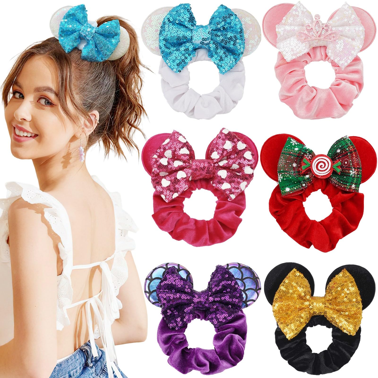 6 Pack Mouse Ears Scrunchies Velvet Sparkle Sequin Bows Hair Scrunchies Hair Ties Elastic Rubber Bands Christmas Ponytail Holders for Kids Women Girls Adult Christmas Party Decoration
