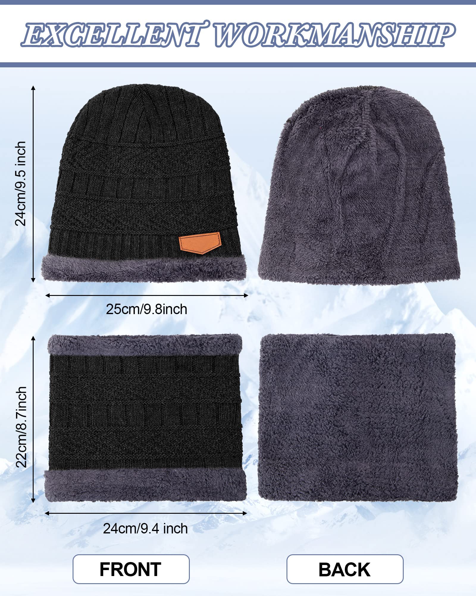 - Size Details: the winter hats for women and men measure approx. 23 x 26 cm/ 9.06 x 10.24 inches, stretchy and elastic, suitable for most heads and head circumferences; The scarf is about 24 x 22 cm/ 9.4 x 8.7 inches and the gloves are approx. 8.86 inches in length