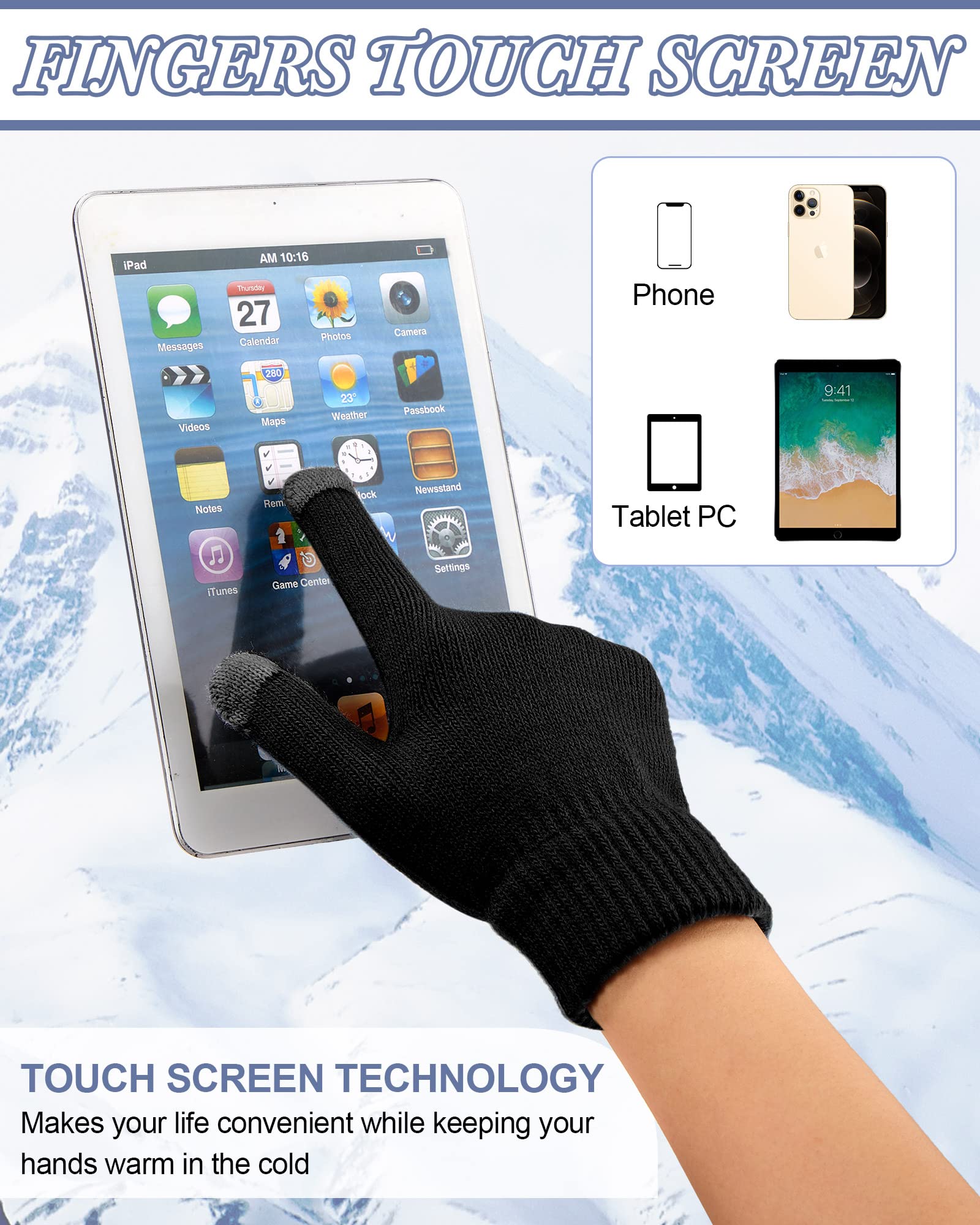 - Touchscreen Feature: 3 fingers of the touch screen gloves are conductive material, allows you to enjoy using your smartphone, tablet, or other touch screen device in cold weather, convenient for you to drive, text, type without taking them off, which are practical for use in cold winter