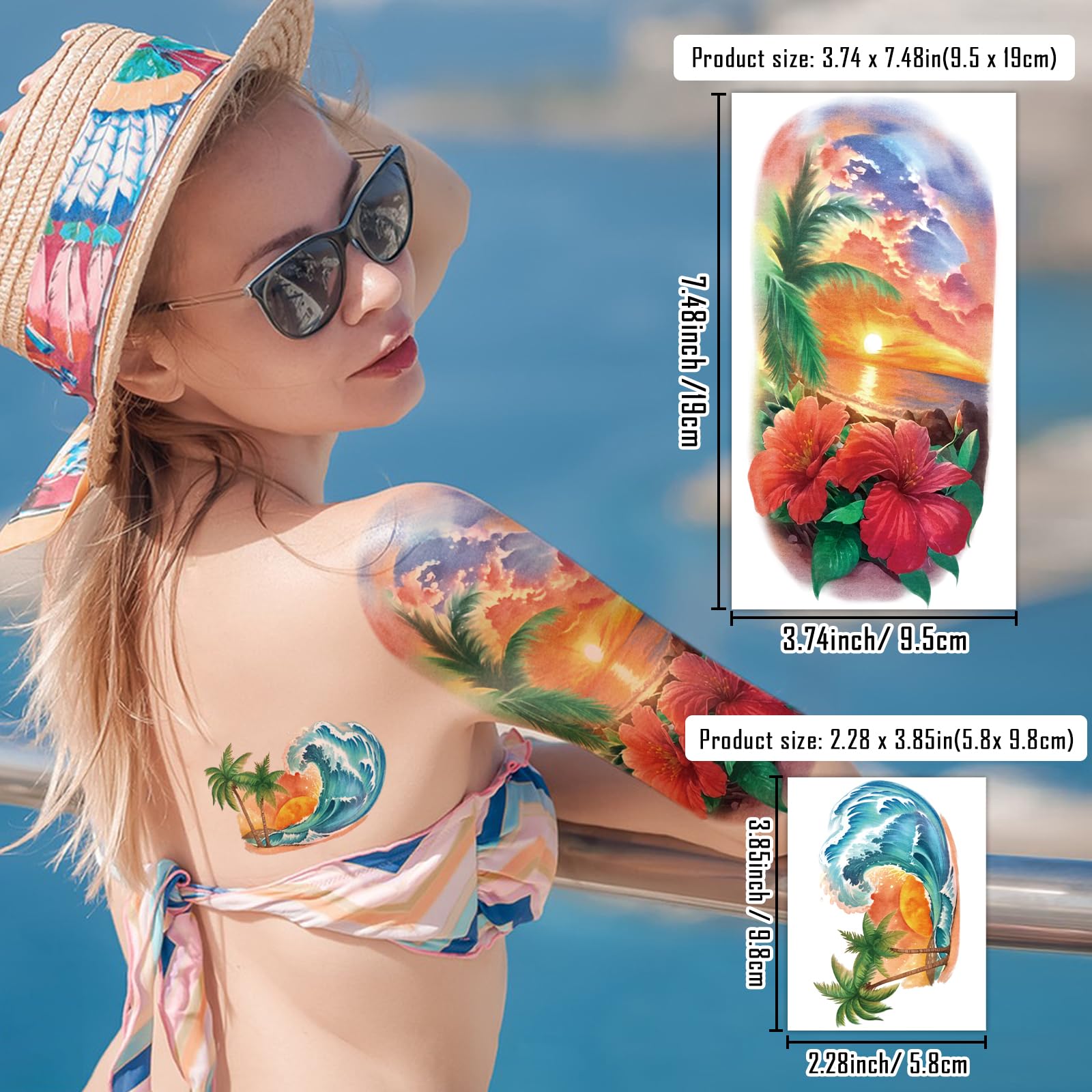 - UNIQUE DESIGN -- include beaches, flower, tree, skull, sunset, holiday, ocean, sailboats sunglasses and other colorful beach elements and more. Can be attached to various parts of the body, such as arms, shoulders, back, thighs, waist, etc. Our tattoo sticker for girls, teenagers, women, men, adults & kids