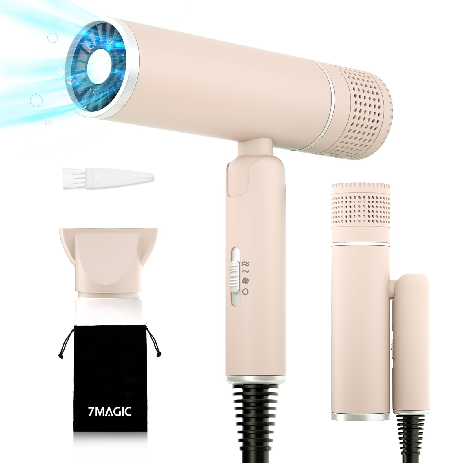 7MAGIC Foldable Hair Dryer, Powerful Ionic Blow Dryer for Fast Drying, Travel Hair Blow Dryer with Storage Bag, Lightweight Portable Hairdryer for Women, Cold/2 Heating/2 Speed Settings, Pink