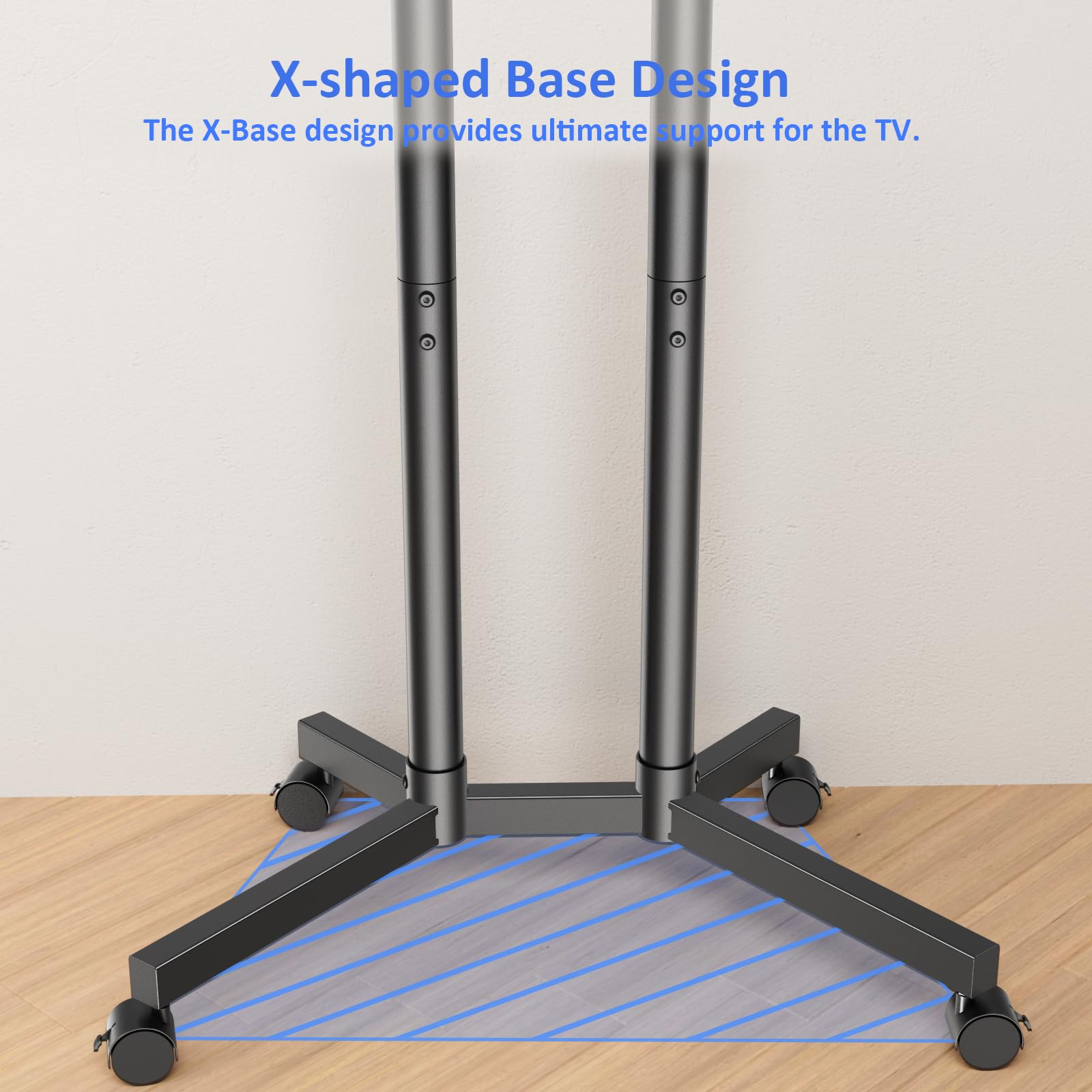 - 【Solid and Stable Rolling TV Stand】This Mobile TV Cart with wheels features an X-shaped base and dual columns design that evenly distributes the weight of your TV, making it more stable and reliable.