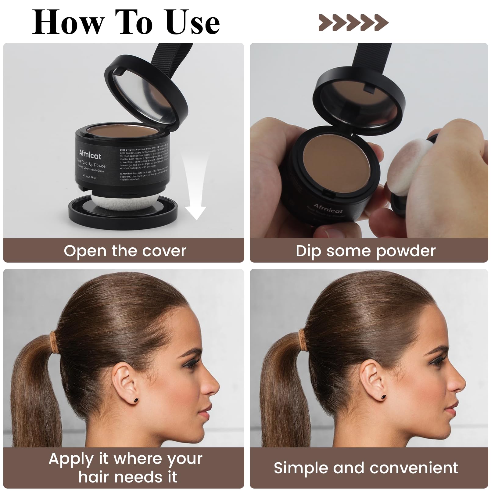 - EASY TO USE:Open the bottom of the bottle and apply hairline powder with a small powder puff to the area you need to cover.Simply apply it with the included blend brush stick to dry hair and watch as your roots and hairline flaws disappear.