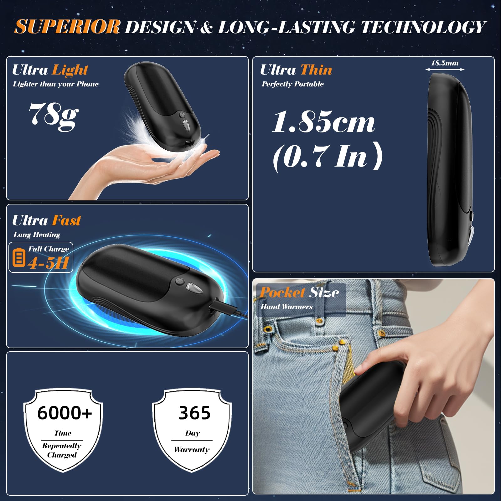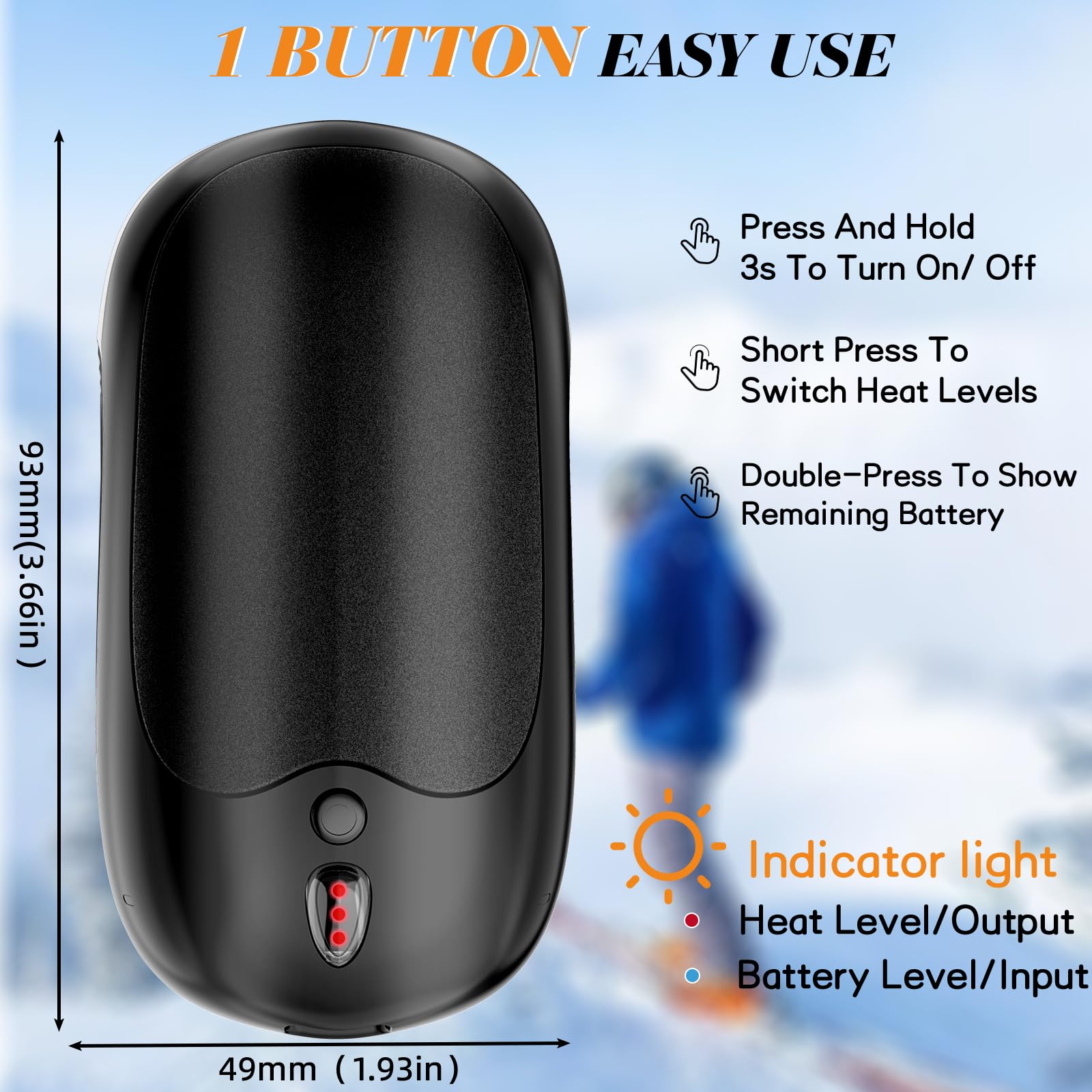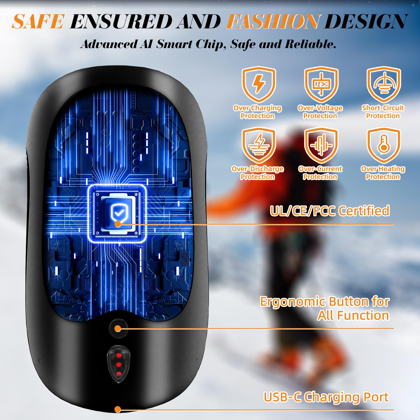 - 【Longer Lasting Warmth】 With a large 6000mAh battery capacity and our latest AI smart chip control, the electric hand warmer rechargeable provides you with up to 8-20 hours of warmth during the chilly winter. It effortlessly caters to your entire day's needs. The 3-level indicator lights keep you informed about remaining battery power and heating status, perfectly addressing your diverse requirements. Included Type-C charging cable can quickly charge the hand warmer.
