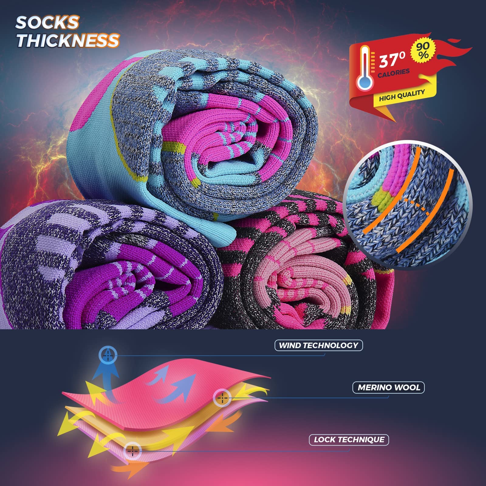 - 1. Premium Quality: Crafted with a blend of cotton, polyester fiber, nylon, and elastic fiber, our AII Thermal Ski Socks guarantee durability and long-lasting performance.
