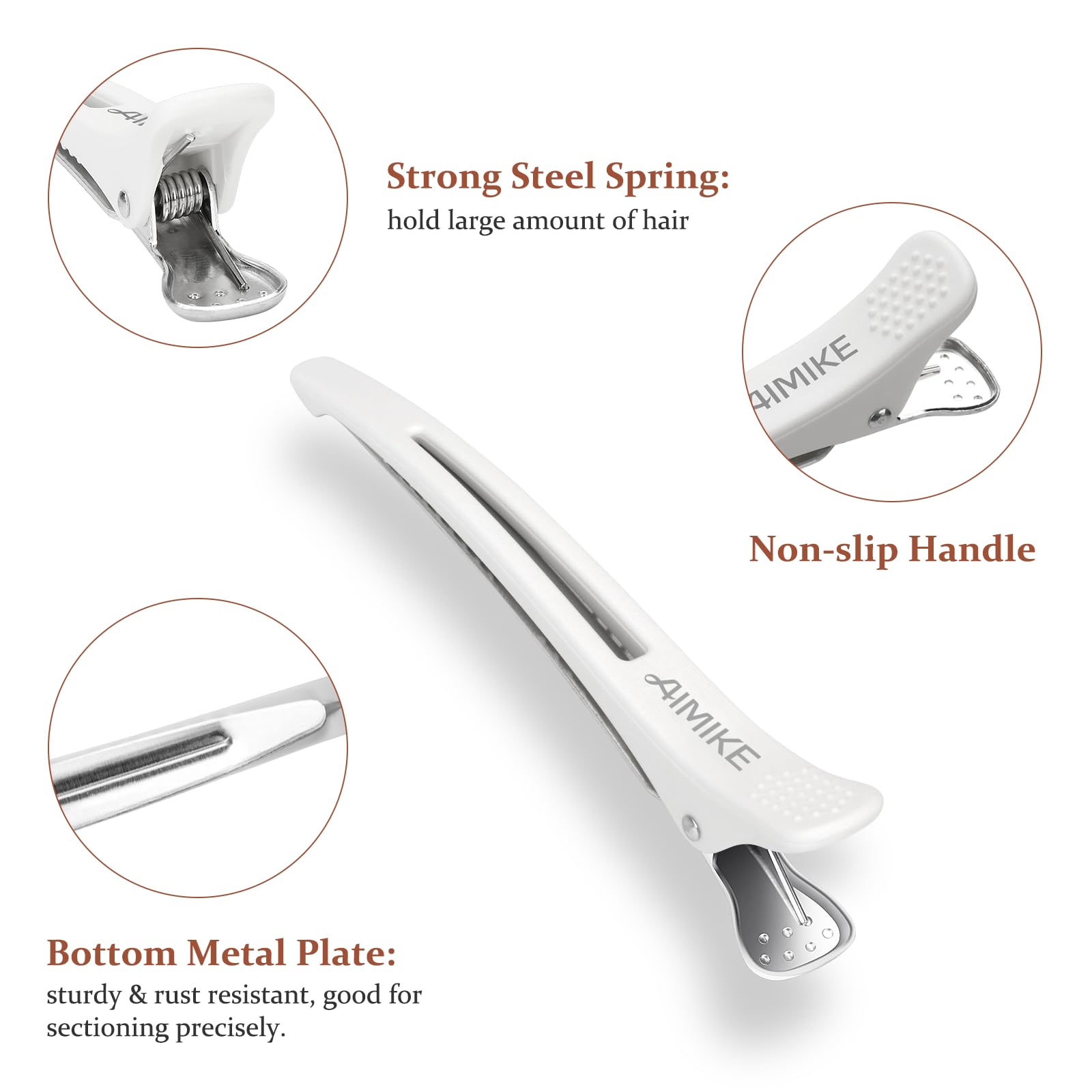 AIMIKE 6pcs Professional Hair Clips for Styling Sectioning, Non Slip No-Trace Duck Billed Hair Clips with Silicone Band, Salon and Home Hair Cutting Clips for Hairdresser, Women, Men - White 4.3” Long