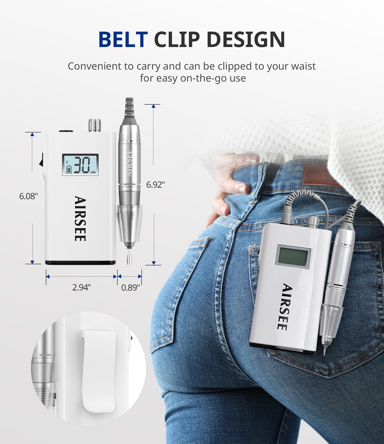 AIRSEE Rechargeable 30000RPM Electric Nail Drill Professional Portable E File Machine for Acrylic Nail Natural Extension Gel Nails Polish Cuticle, Cordless High Speed for Salon Home Use E8 White