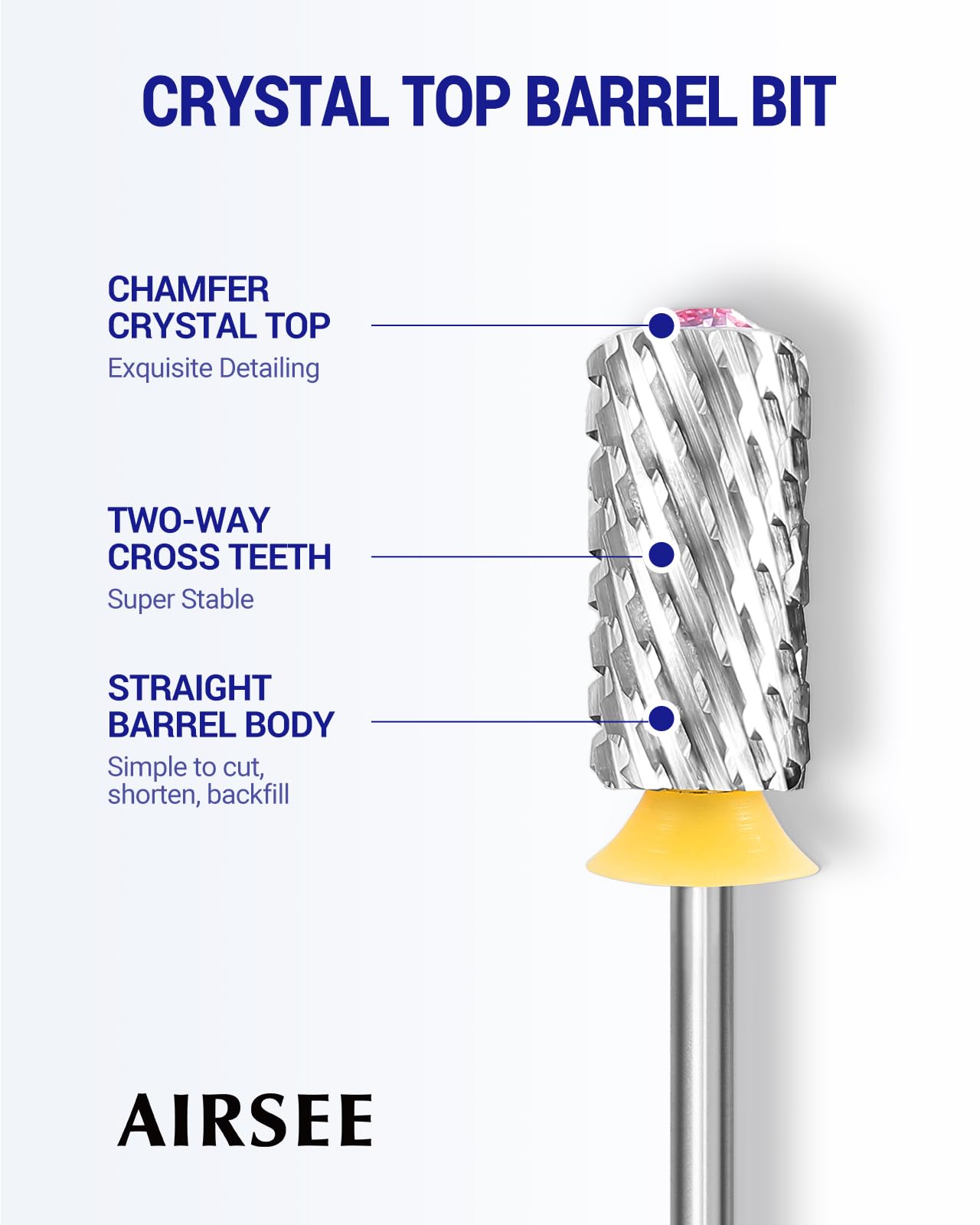 - Shape: Crystal Cylinder Barrel: Adorned with crystals at the top, our drill bit boasts a luxurious and elegant design; The chamfered top edge is expertly crafted to protect your cuticles and sidewalls from scratches and cuts during use