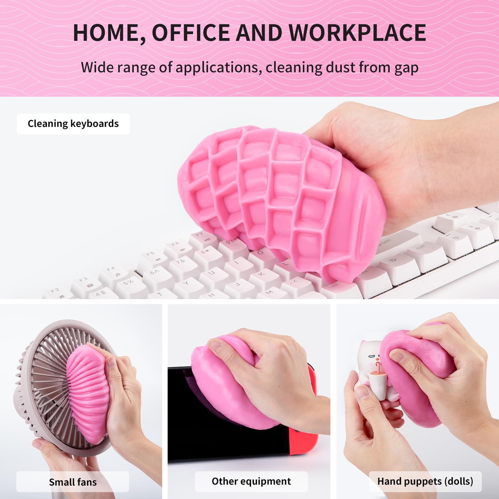 - Easy to use: keep your palms dry before use, take the keyboard cleaning gel, knead it into a ball, slowly press the detailing putty into the keyboard, car vents and other uneven surfaces, gently roll or press for about three to five seconds. Then slowly pull it up and the dust will be taken away with the cleaning putty.