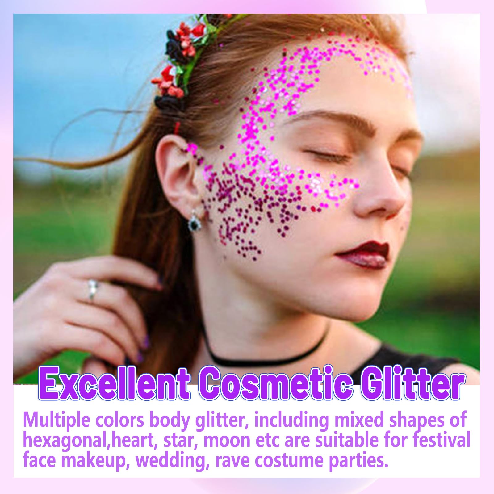 - Works Great: The holographic sequins mix different sizes of hexagons chunky holographic glitter stars, moons, laser glitter and shamrock sequins, which makes it easy to evenly apply them on the skin and achieve pretty shimmer glitter makeup just using a little glitter face paint.