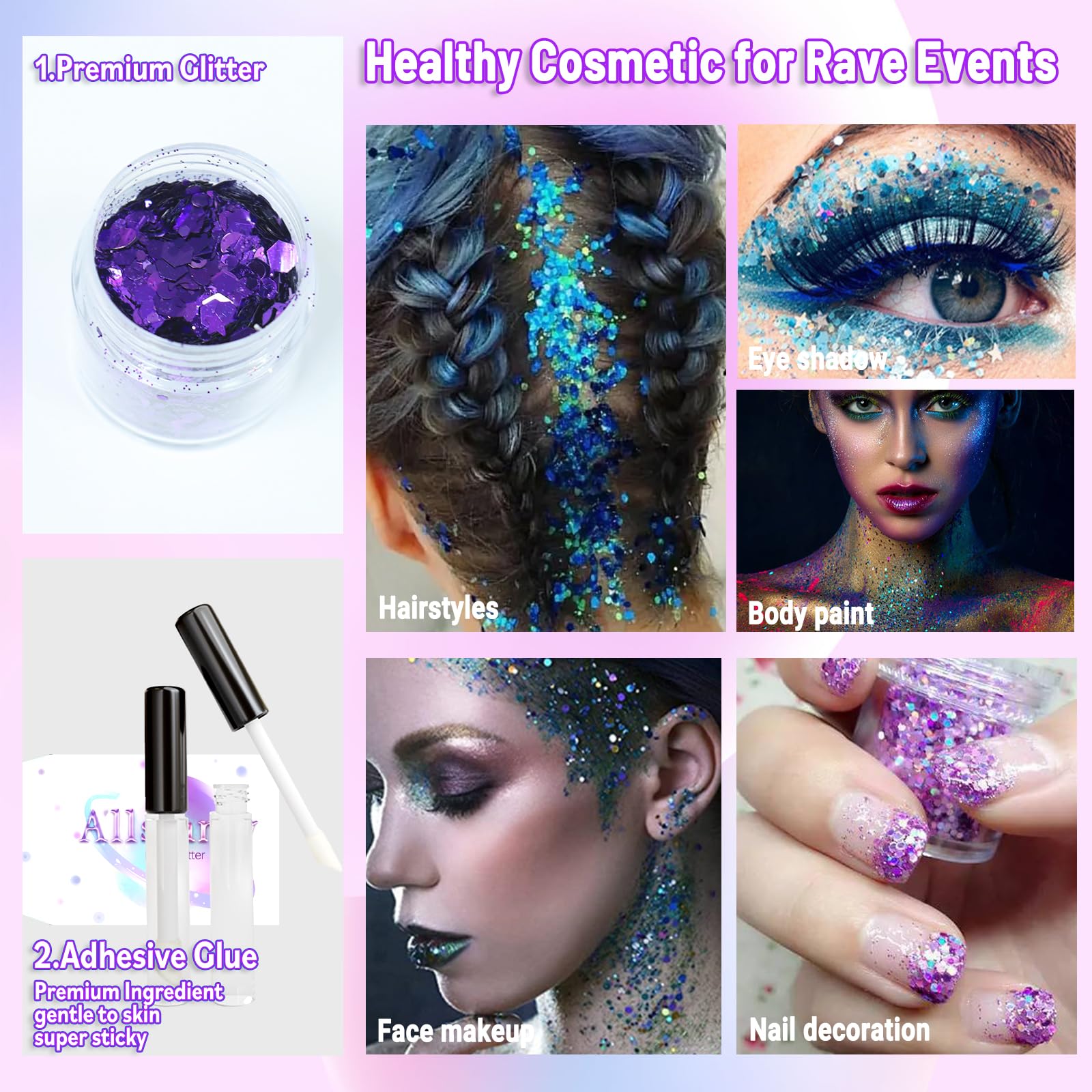 - Easily Use: The loose glitter pack comes with 4 tubes of cosmetic glitter glue and 12 jars of holographic glitter. And these face glitter gel is quick-dry, which matches for rave accessories and contributes to face gem glitter that sticks to the whole body.