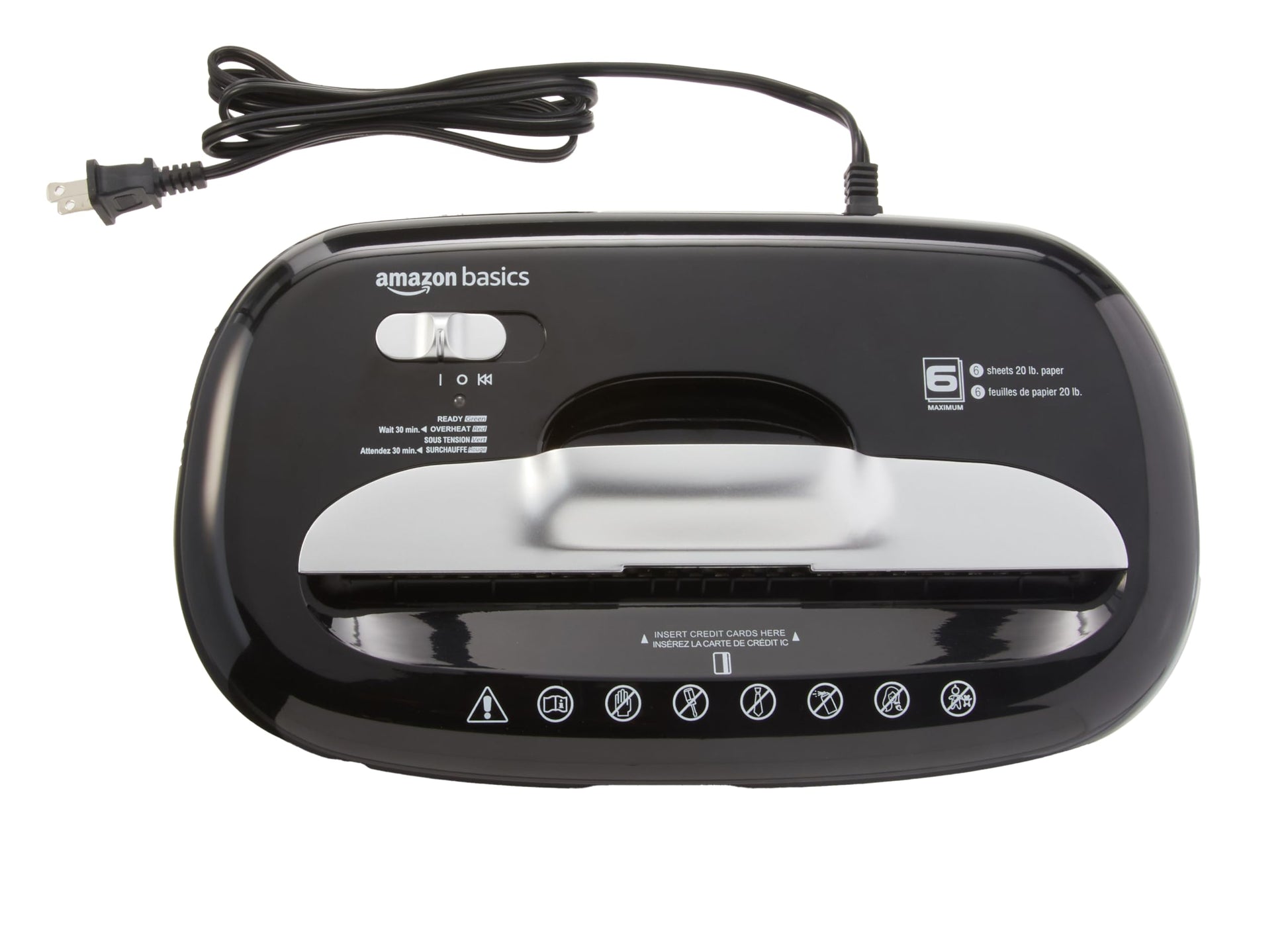 - Shreds up to 6 sheets of 20-pound bond paper at a time; also destroys credit cards (one at a time, through dedicated slot), staples or small paper clips