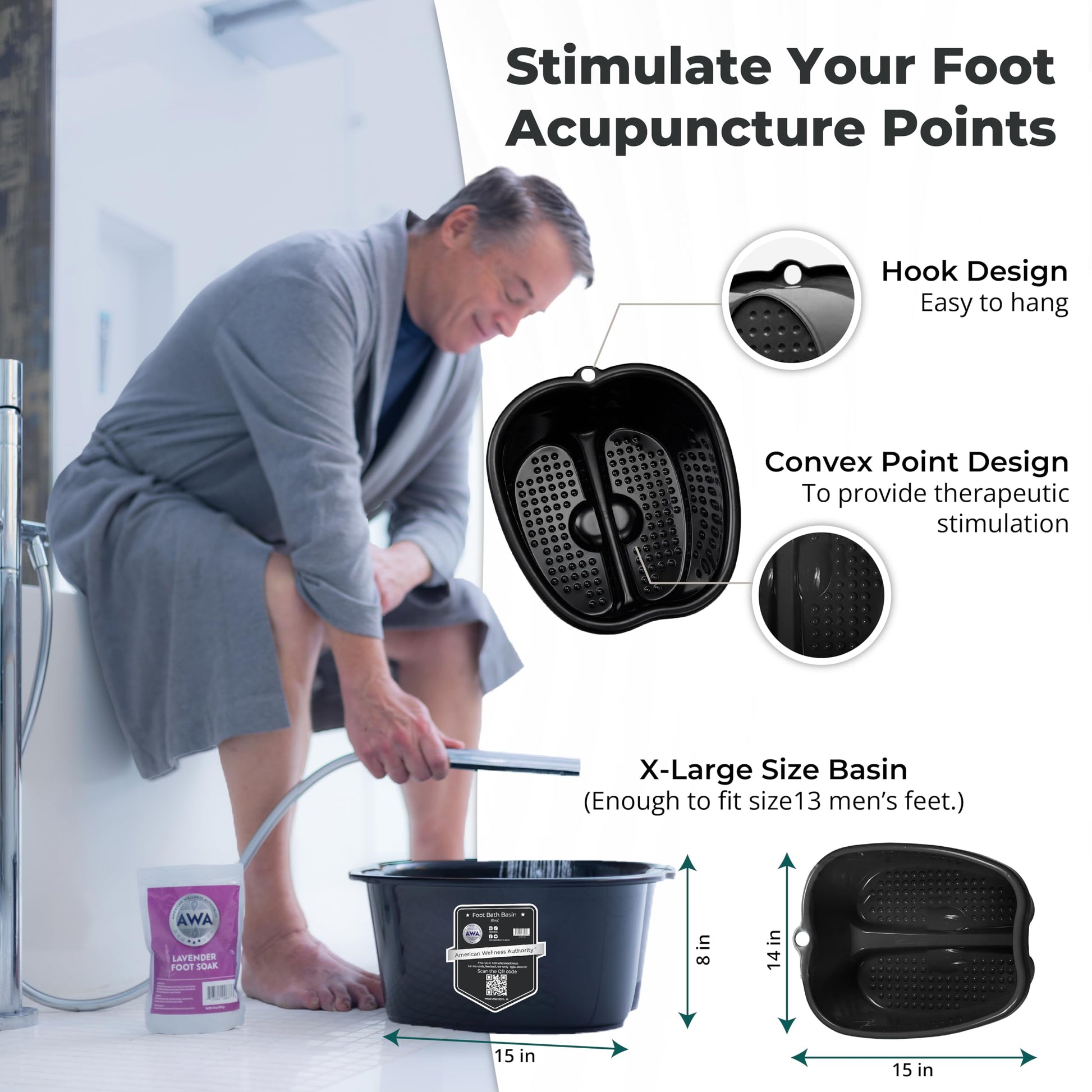 - Our foot bath soak tub is designed with convex dots and a rounded arch supports on the foot pad for maximum pressure point relief. This is great for treating tired feet, sore feet, bunions, calluses and dry skin. Pamper and treat your feet from heel to toe and use this tub with epsom salts, essential oils, bath bombs or even some AWA tea tree foot soak.