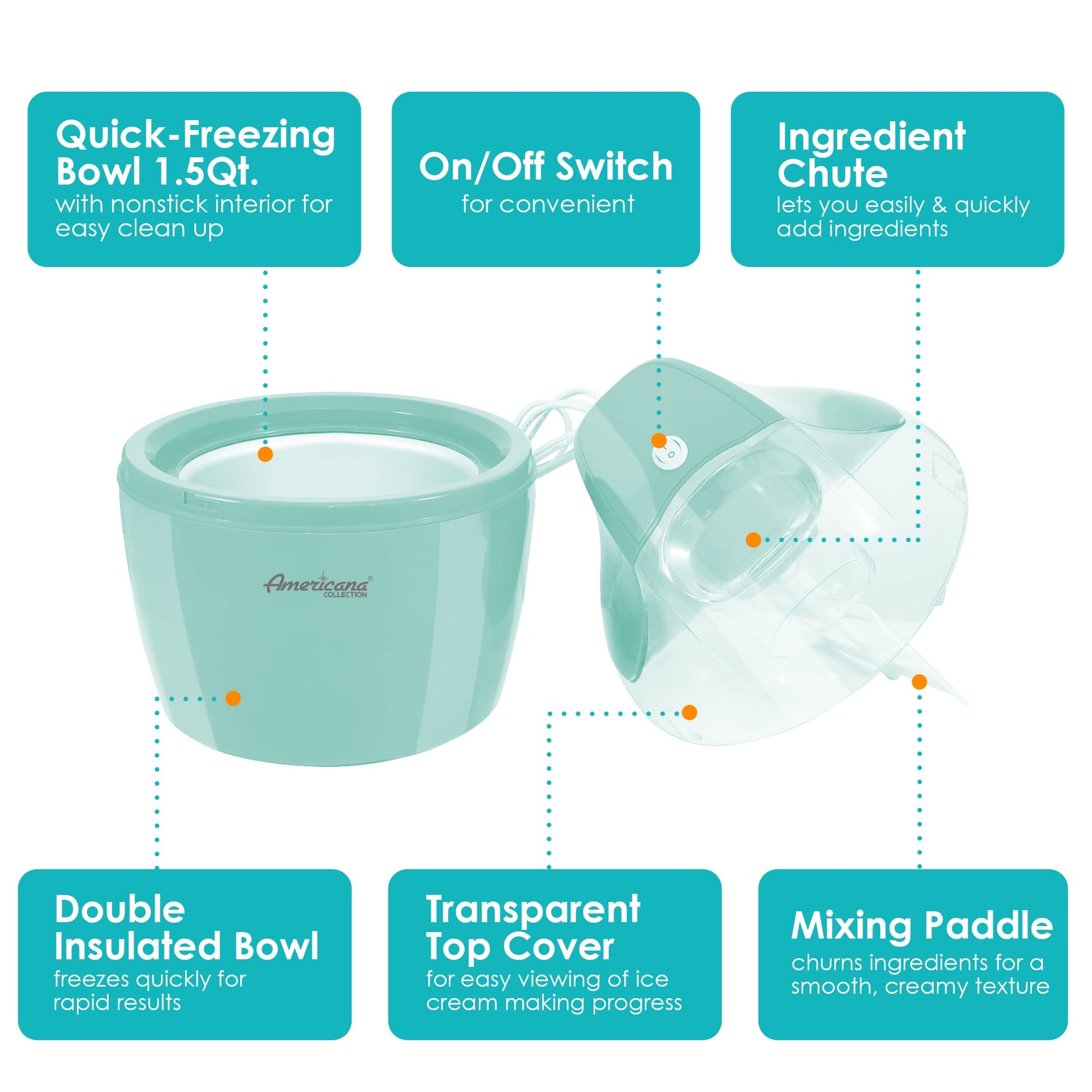 Details: The Americana 1.5Qt. Electric ice cream maker churns out delicious homemade ice cream in less than 40 minutes. It features a 1.5-Quart quick freeze bowl and a powerful motorized paddle, so making ice cream is fast, convenient and fun for the whole family! It's great for entertaining at family parties, BBQ and picnics using all of your favorite ice cream, sorbet, gelato and even frozen yogurt recipes. The motor turns the paddle that whips air into the ingredients producing a smooth, rich soft serve ice cream. The paddle quickly crushes cookies, fruit, chocolate chips or a variety of other yummy toppings and thoroughly integrates them into the mixture. All parts conveniently remove for easy cleaning.