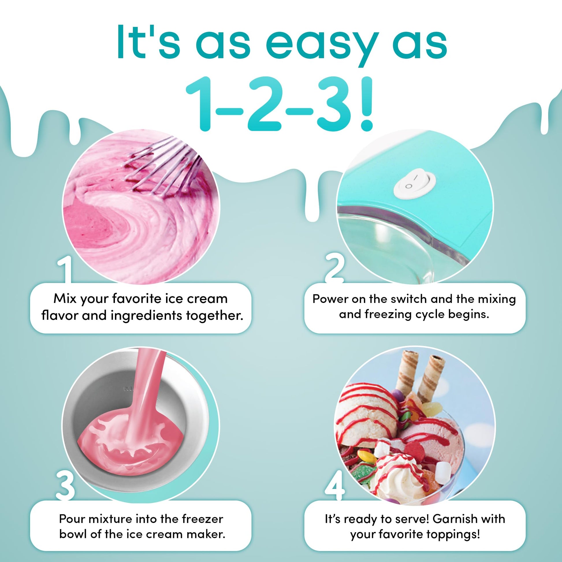 - cQUICK & EASY TO USE: The ice cream and dessert maker is simple to use. Simply freeze the bowl overnight, then add the ingredient mixture into the machine, push a button and you'll have a tasty dessert in a short time.