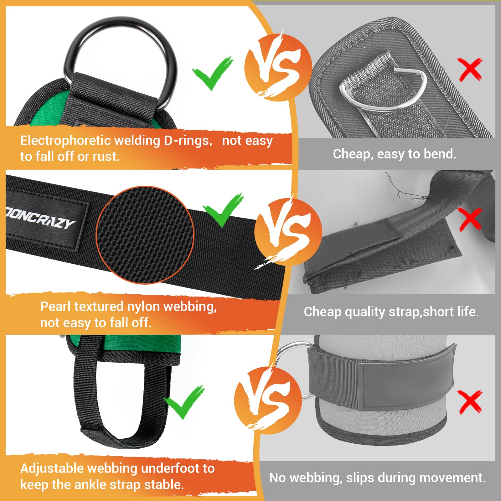 —Our ankle straps come with extra straps that act like bodyguards for your ankles, saving you from slipping and cutting your feet during workouts. We've got your ankles' safety covered like a pro.Our ankle straps are equipped with electrophoretic welding D-rings that are practically glued to perfection, ensuring they won't let you down or rust.
