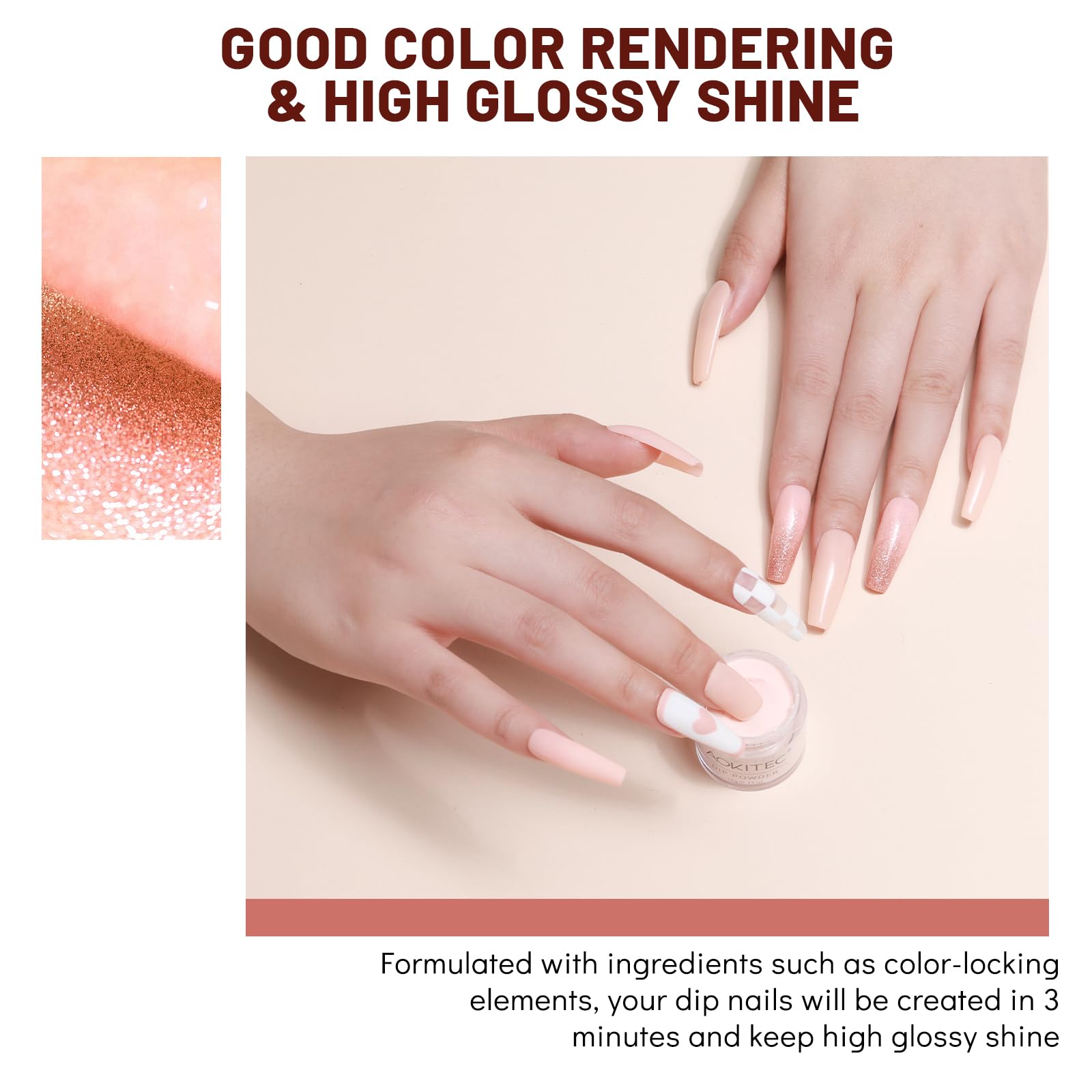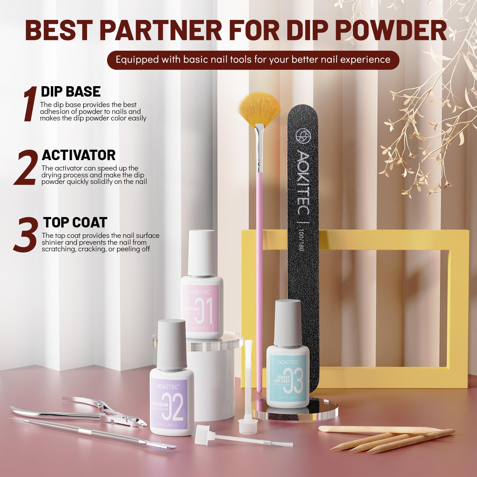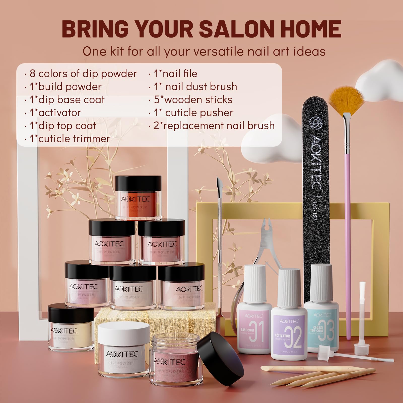 - 🎁【8+1 Colors Upgraded Starter Kit】Aokitec 23 Pcs all-in-1 Nude Pink Brown Giltter dip nails powder starter kit: 8*10g (0.33oz) color dip powder,1*Dip Build Powder, 3*10ml dip powder liquid set(base gel/activator/top gel),1*cuticle trimmer, 1*nail file, 1* nail dust brush, 5*wooden sticks, 1* cuticle pusher, 2*replacement nail brush. A truly complete dip nail system that comes with everything you need.