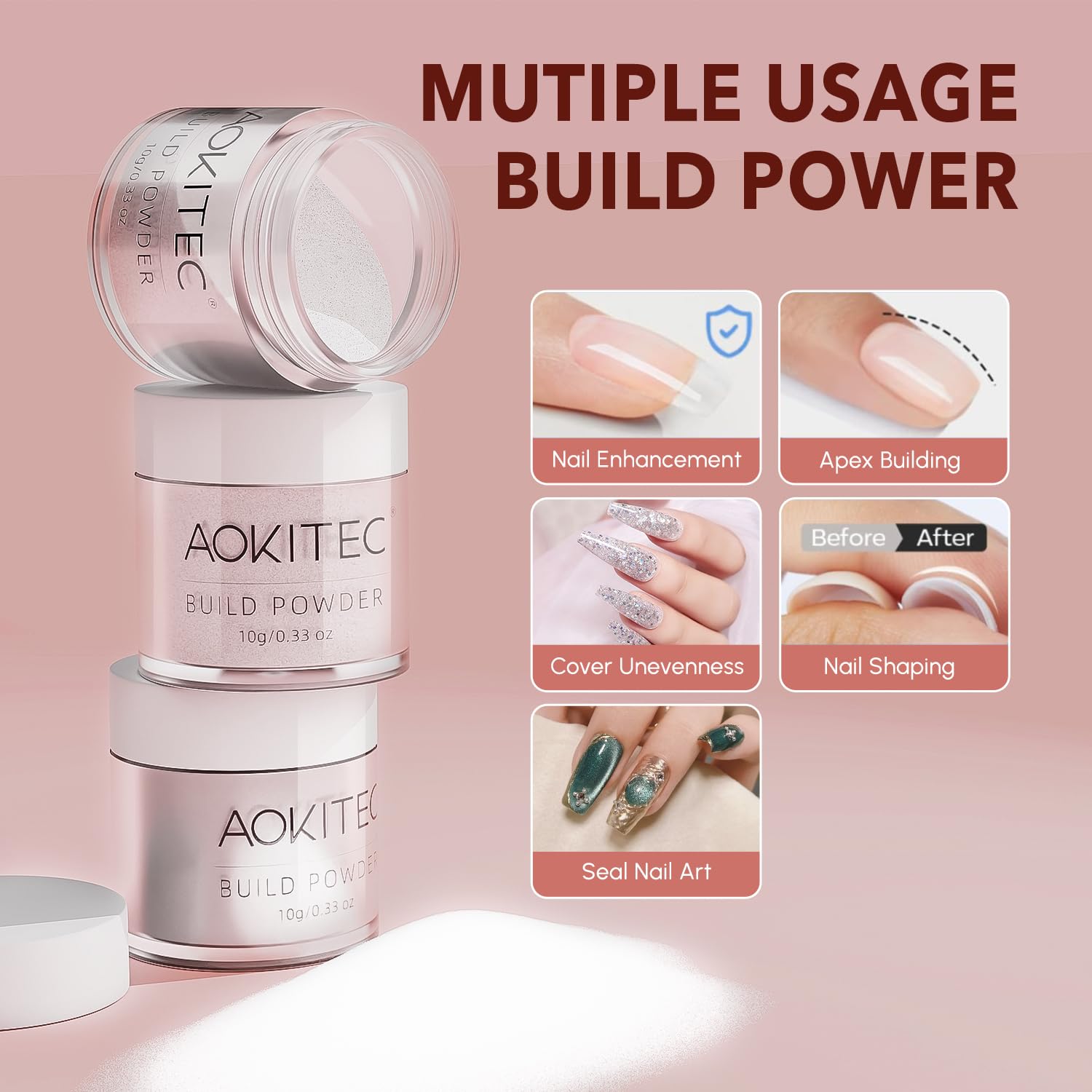 - 🌎【Nail Care Excellence】Aokitec dipping powder nail kit provides a clear build powder included is a game-changer for nail repair, while the accompanying nail tools kit ensures comprehensive nail care. Keep your nails in top condition with this must-have set. You can use this clear build powder to repair cracked or weak nails, overlay on sequins, or 3D nail art.