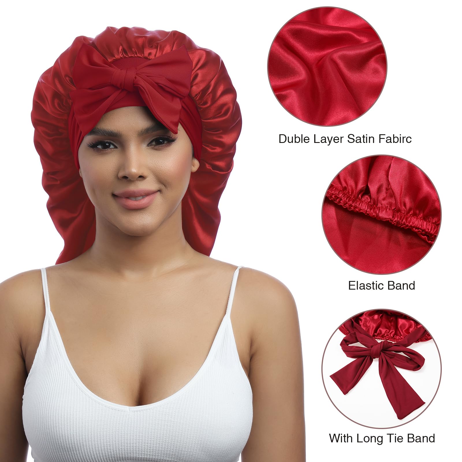 AWAYTR Long Satin Bonnet for Women - Double Layer Elastic Silk Bonnet for Braids Hair Sleeping Cap with Tie Band (Wine Red)