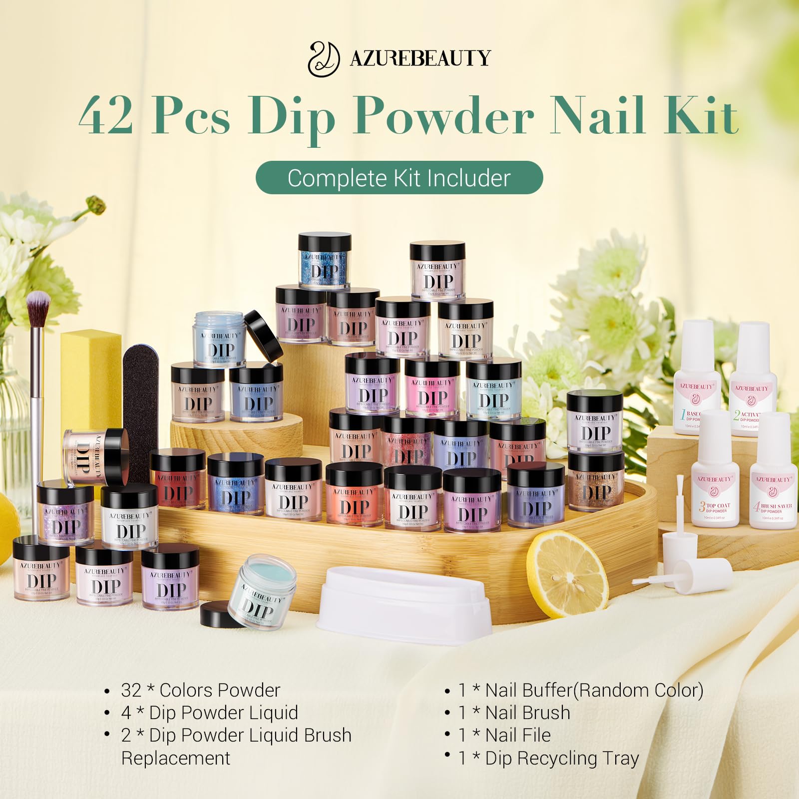 - 🌈【2024 New Nail Dip Powder Kit】AZUREBEAUTY New All Season Spring 32 dip powder colors(includes new starry glitter brown blue purple) 4 Pcs dipping powder liquid set(with base coat/top coat/activator/brush saver) 1*Nail brush, 1*Nail file, 1*Nail polishing block,2*Nail brush replacement, and new 1*Dipping powder recycling tray, AZUREBEAUTY dipping powder kits are complete and value for money.