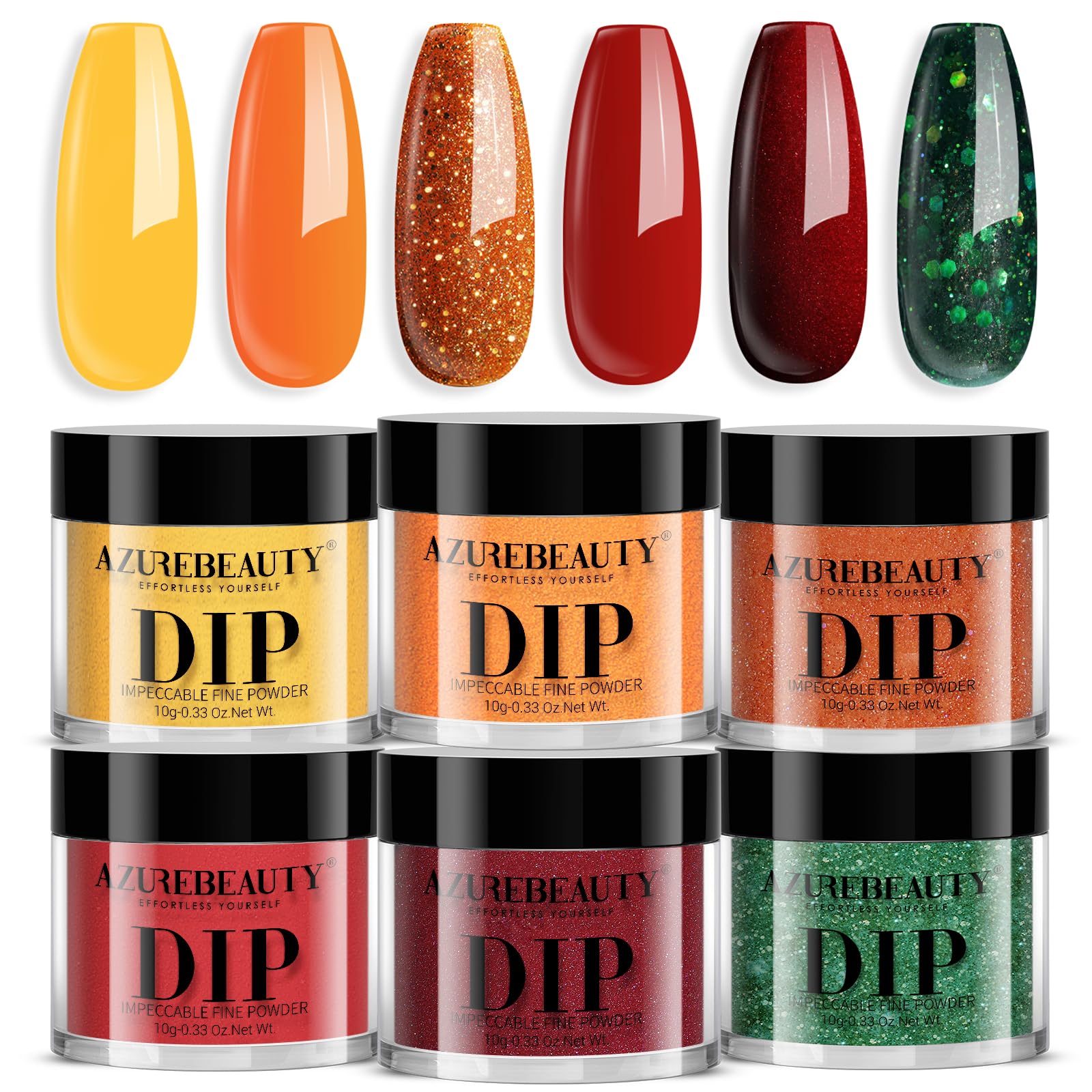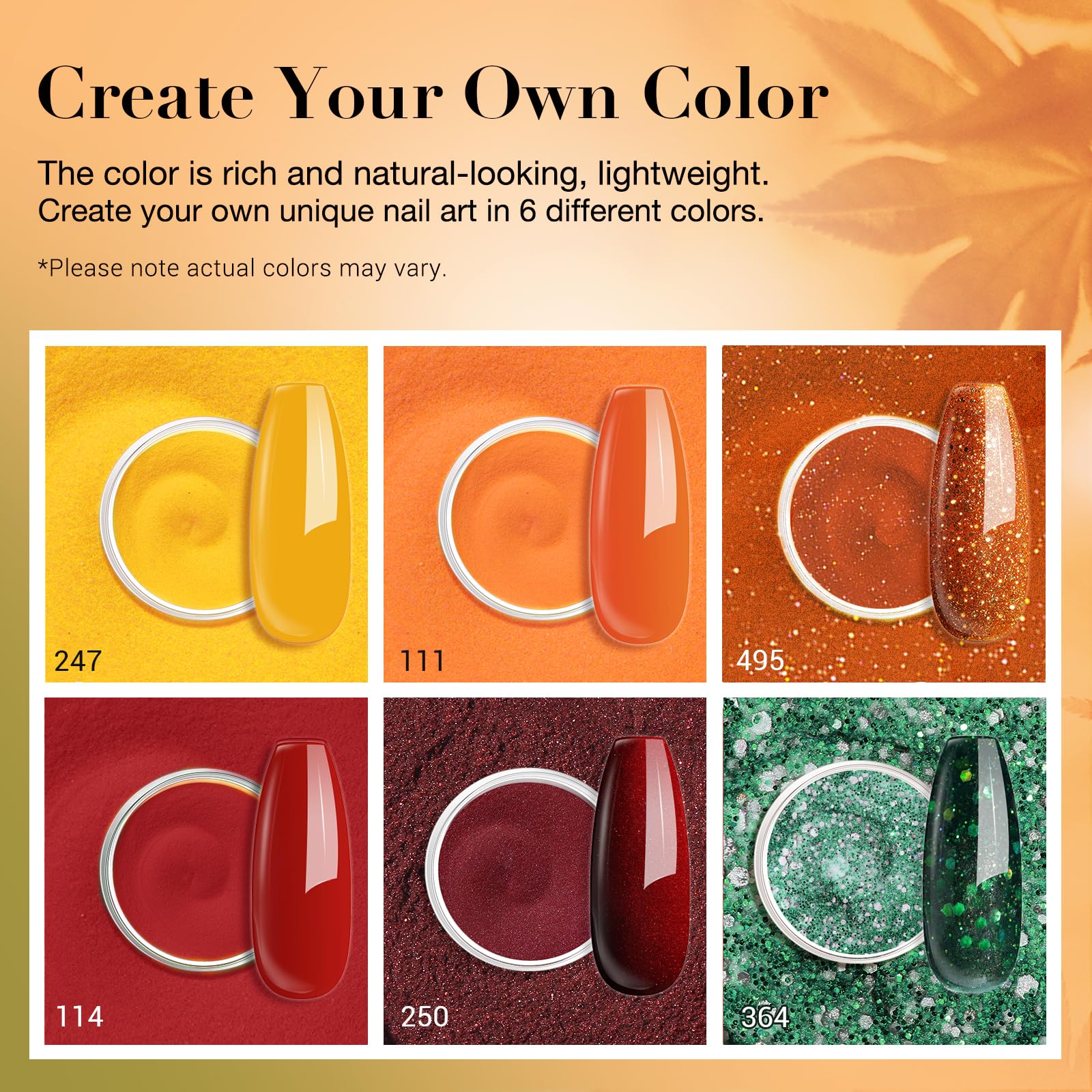 - What U Get: With this premium dip powder set covering 6 fall colors, yellow, pumpkin orange, red, burgundy, and green glitter silver(10 g per box), your nails will look brilliant shiny finish, be lightweight, and more attractive