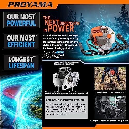 PROYAMA 54cc Post Hole Digger Gas Powered 2 Cycle Earth Auger, 5-Year Warranty Gear Box, 4 Drill Bits 4" 6" 8" 12" + Extension Rod 12" 20"