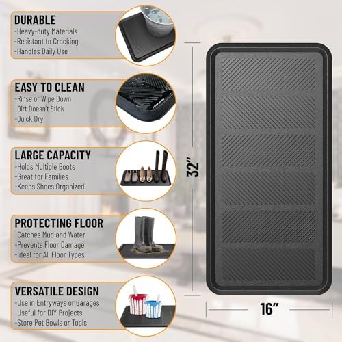- [ALL WEATHER NONSLIP RUBBER]: This boot tray with durable, high quality and all-weather rubber material. The rubber minimizes slipping and all-weather protection makes the boot trays long lasting and can be outside all year long with its all-season viability and waterproof material.