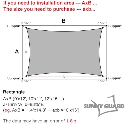 - 【Measuring Dimensions】Measure and clean the area where the Sun visor is to be installed. Leave a margin of 0.5-1 feet between the fixing point and the sunshade sail to install hardware/hooks or ropes. (Please refer to the measurement pictures we provided).Due to the characteristics of this material, the finished product may have a deviation of ± 4 inches.